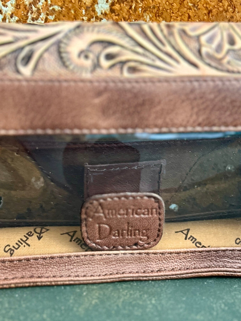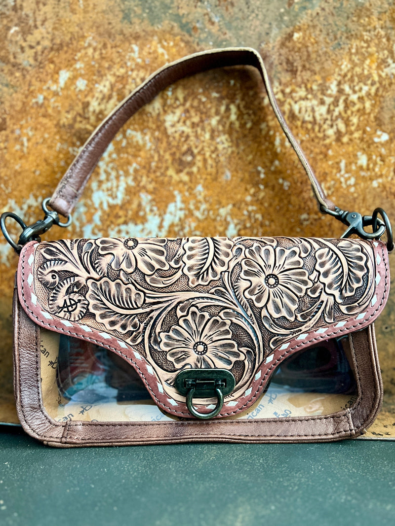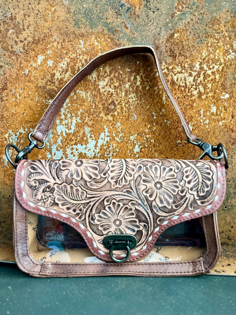 This Darling I Can See Right Through You Clear Bag is a must-have for any fashion-forward individual. The tooled leather design adds a touch of sophistication, while the floral tooled pattern adds a whimsical touch. With an 18" removable leather handle and 10"W X 6"H size, this bag is both functional and stylish. Stay on trend with this clear bag that lets you show off your belongings.