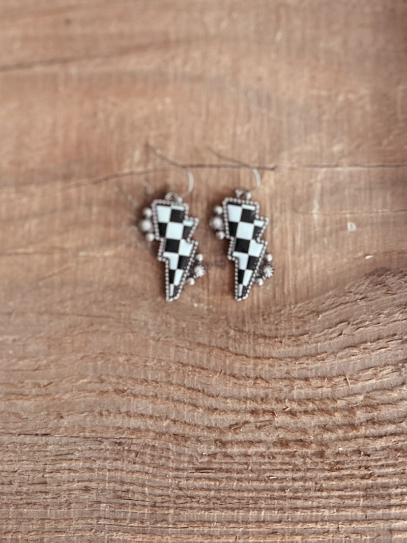 Black And White Checkered Lightening Bolt Dangle Earrings