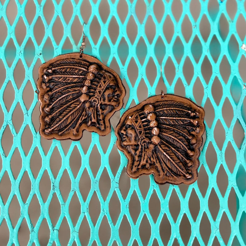 Adorn your ears with the sophistication and elegance of our Leather Chief of Chiefs Earrings. Crafted from luxurious leather, these dangle earrings feature a fish hook design and are adorned with an impressive 3" Indian chief leather stamp. Elevate any ensemble with these tasteful yet stylish earrings.