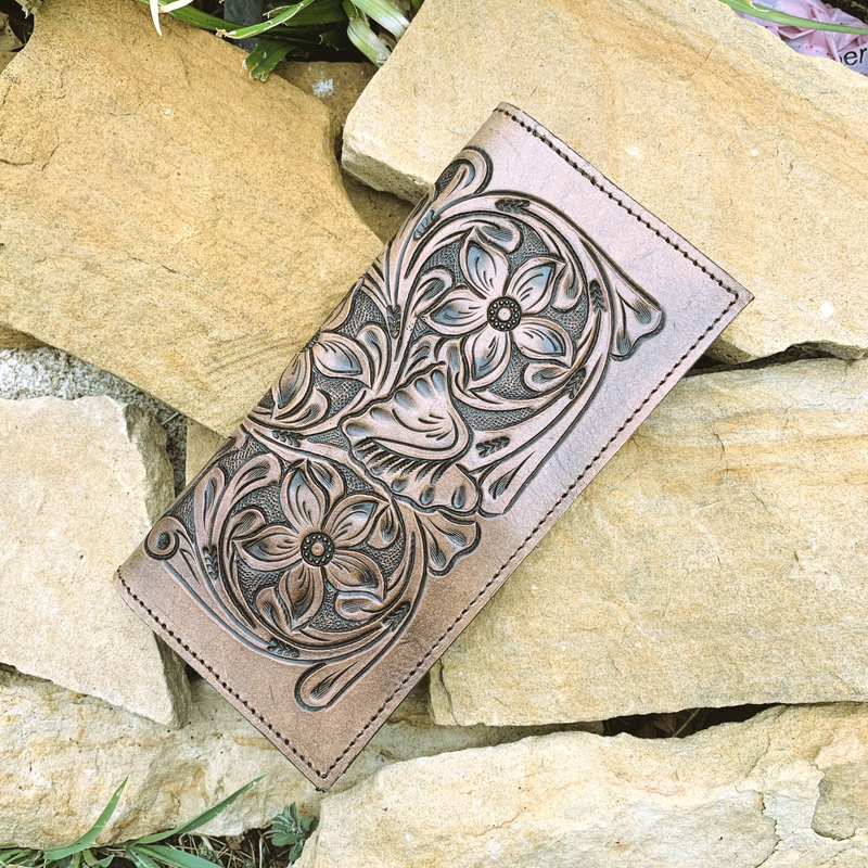 Look classy yet sophisticated with this beautiful tooled leather ,bi-fold wallet with push clasp closure. Plenty of card slots, cash slot, and check book slot.