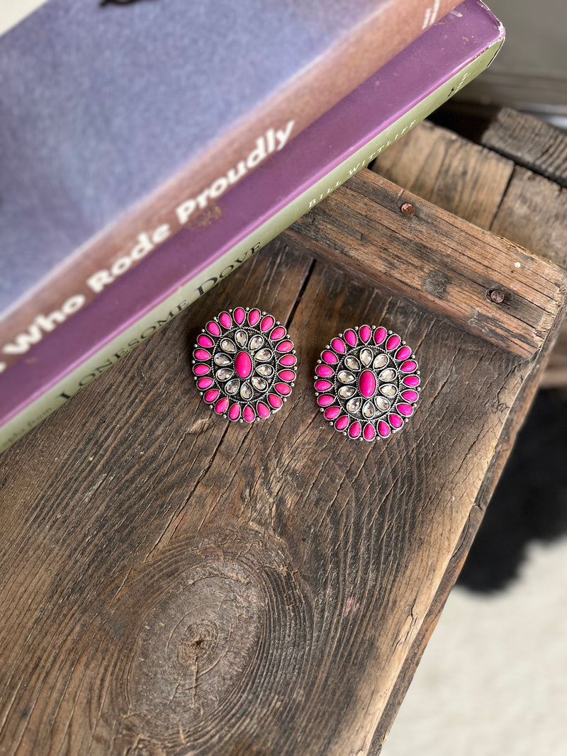 Add a touch of Western style to any outfit with our Large Pink And Rhinestone Cluster Post Earring. These eye-catching earrings feature a cluster of pink colored stones with dazzling rhinestones on a silver backing. The post design makes them easy to wear, making a statement with minimal effort.