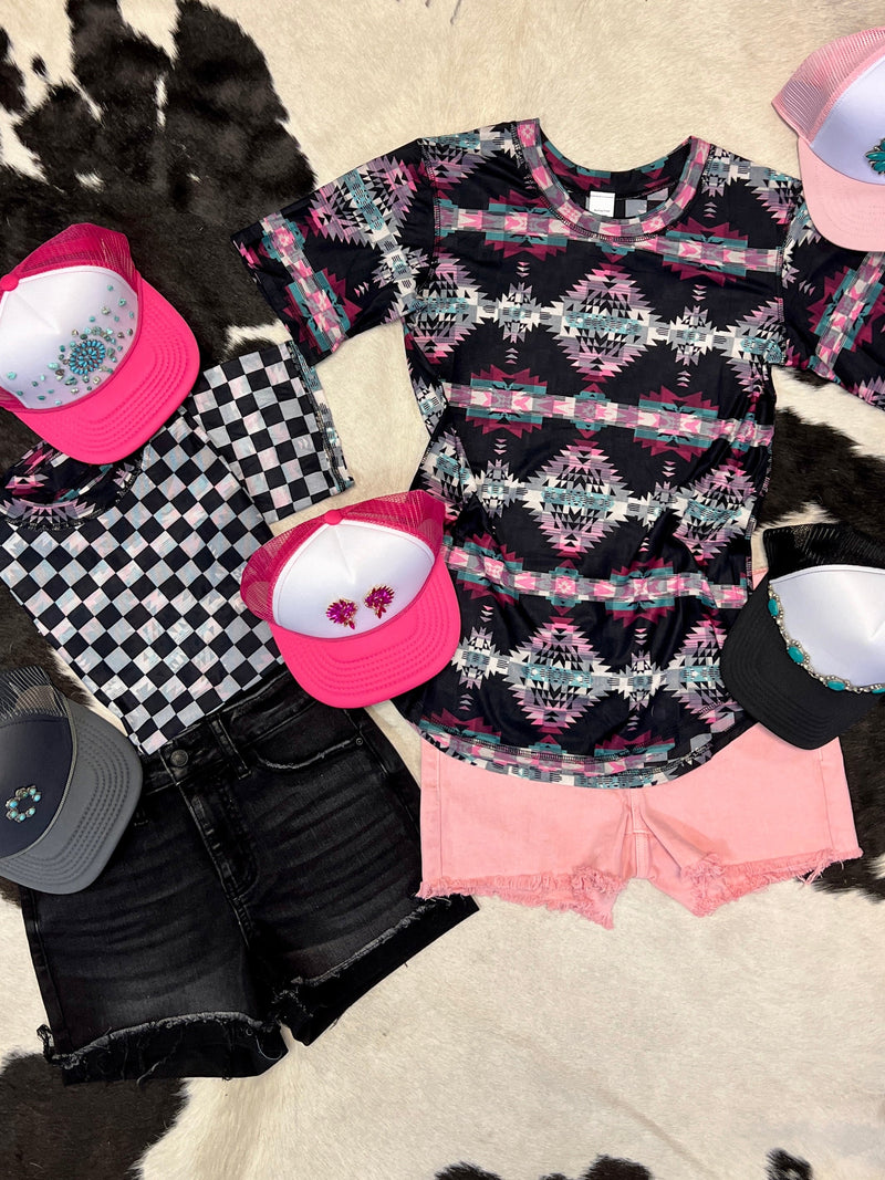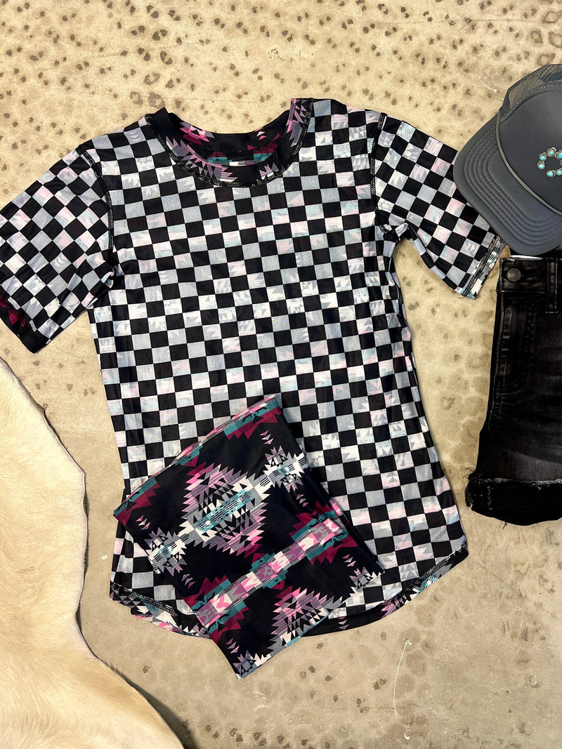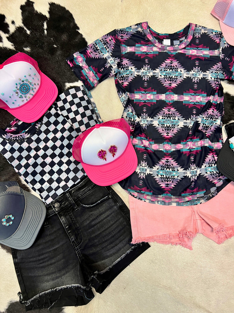 "Get twice the style with our PLUS Looking Back Reversible Top! Featuring a playful checkered pattern on one side and a trendy aztec print on the other, this top is perfect for those who like to mix it up. You'll never get bored with this fun and versatile piece. (Limit 2 exclamation points)