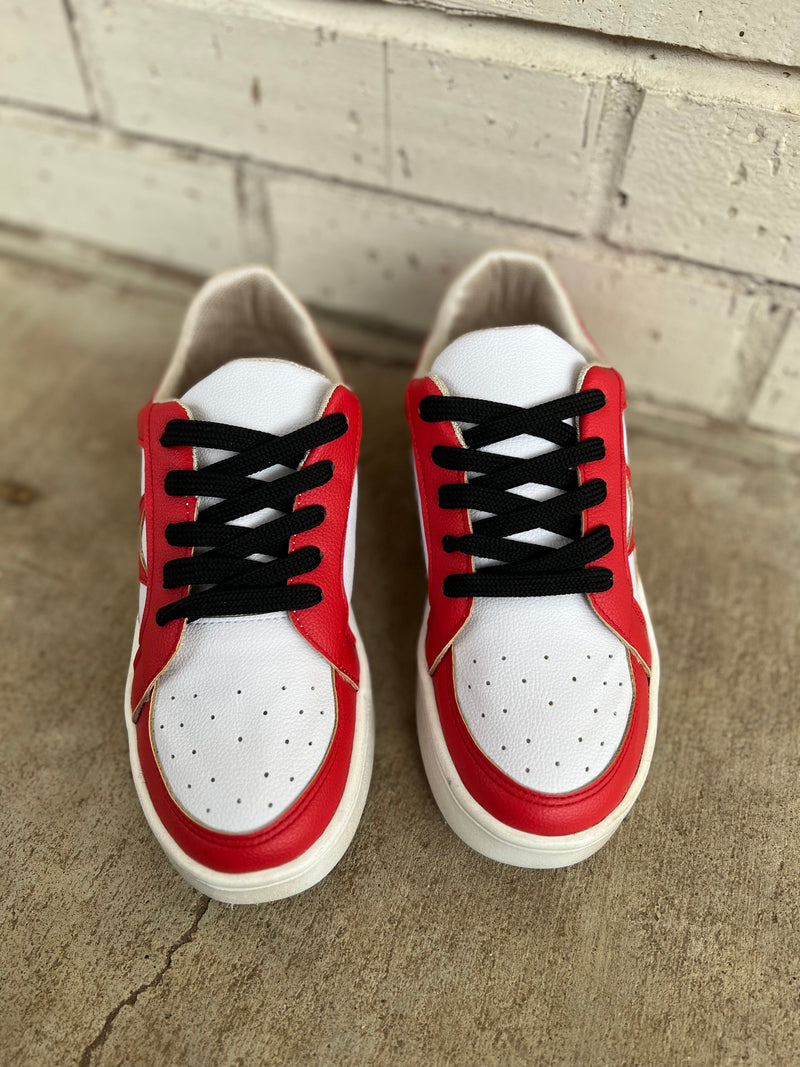 Step up your sneaker game with these Red & Black Game Day Sneakers! Perfect for any occasion, these classics will look sharp with any outfit. The star on the side gives them a unique kick and their game day style means you'll be ready to show your team spirit. Slay the style game in these! Grunge style details, scuffed soles by style.