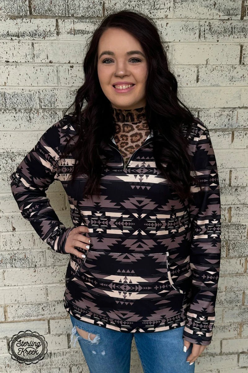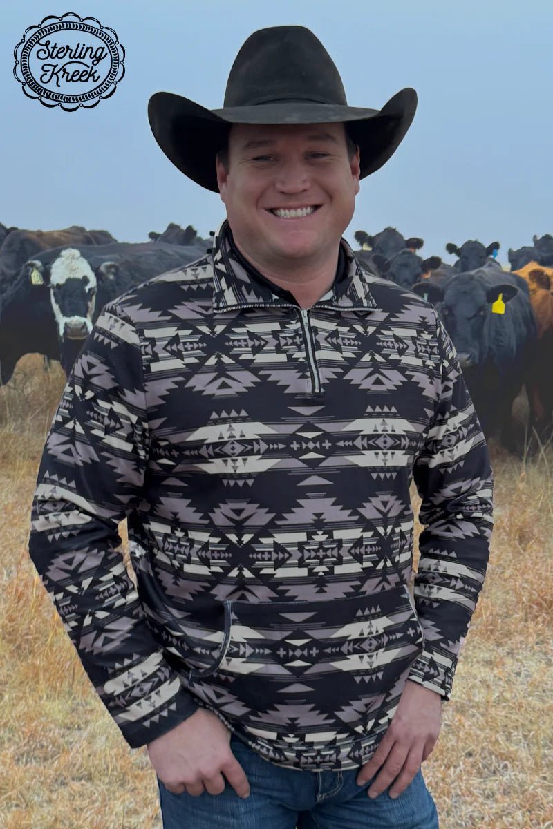 NEW Longer BODY fit! "Stay stylishly warm in our Down In Denver Pullover! This Unisex/Mens quarter zip features a bold black, gray, and cream Aztec design and convenient middle pocket. Perfect for chilly days and cozy nights. Don't miss out - get yours now!"