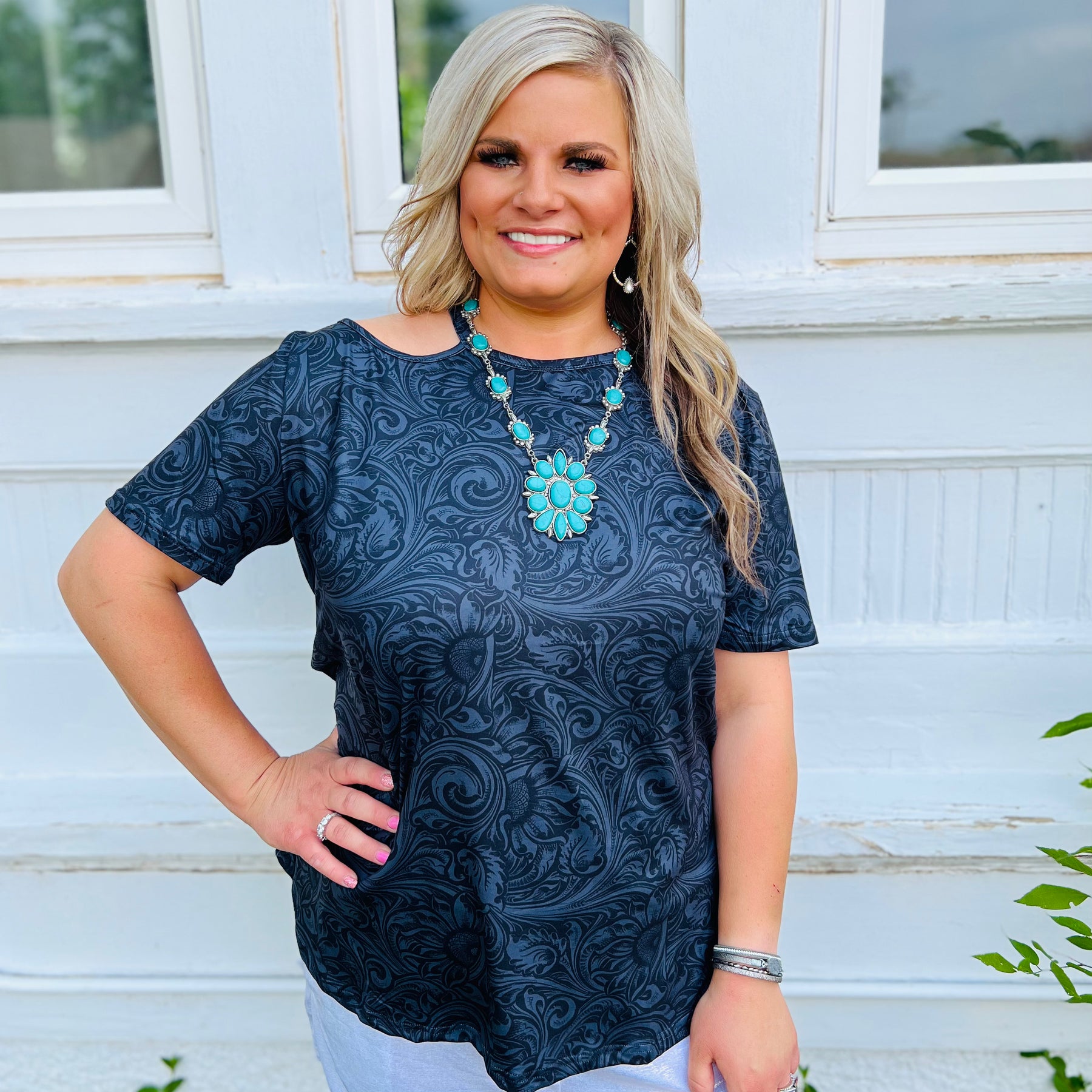 Step out in style with the LIGHTS WENT OUT IN GEORGIA TOP! It's a showstopper with its black tooled leather design and oh-so-flattering shoulder cut out. Make a statement without saying a word - this top is sure to light up the room!