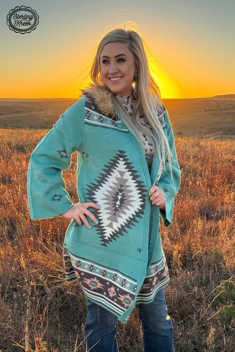 Bring out your inner wild child with this playful turquoise knit cardigan! Featuring an Aztec design, this chic cardigan will spice up any look. With an added bonus of a cozy hood and faux fur strap, this cardigan will make any outfit stand out!