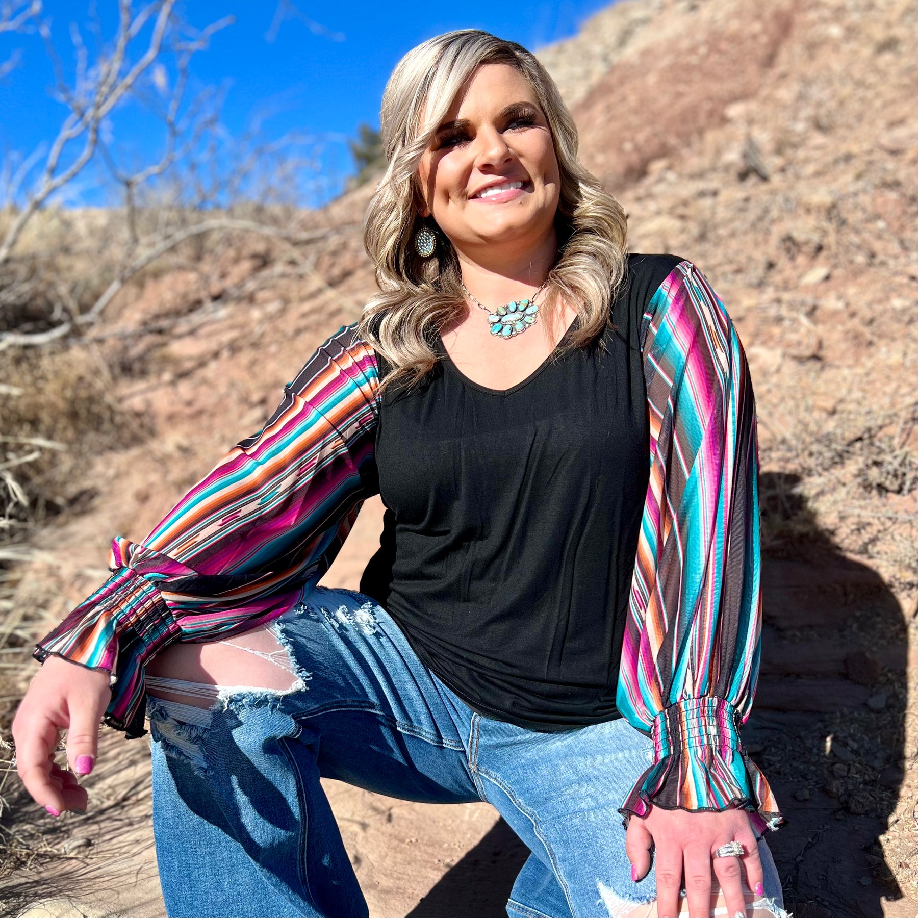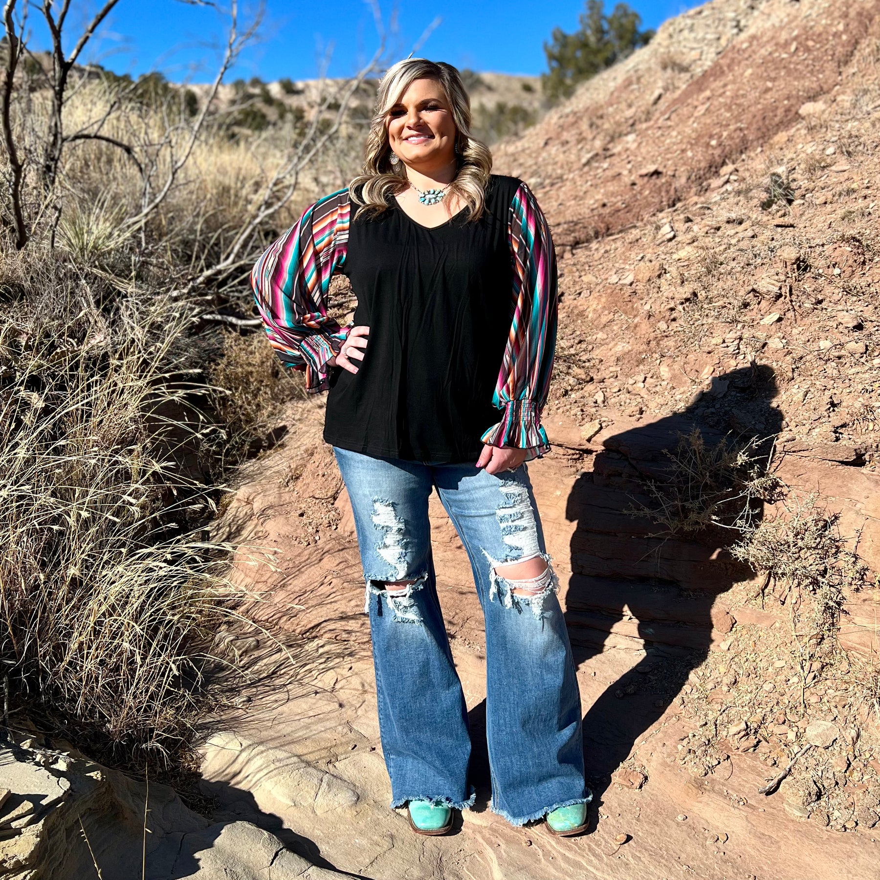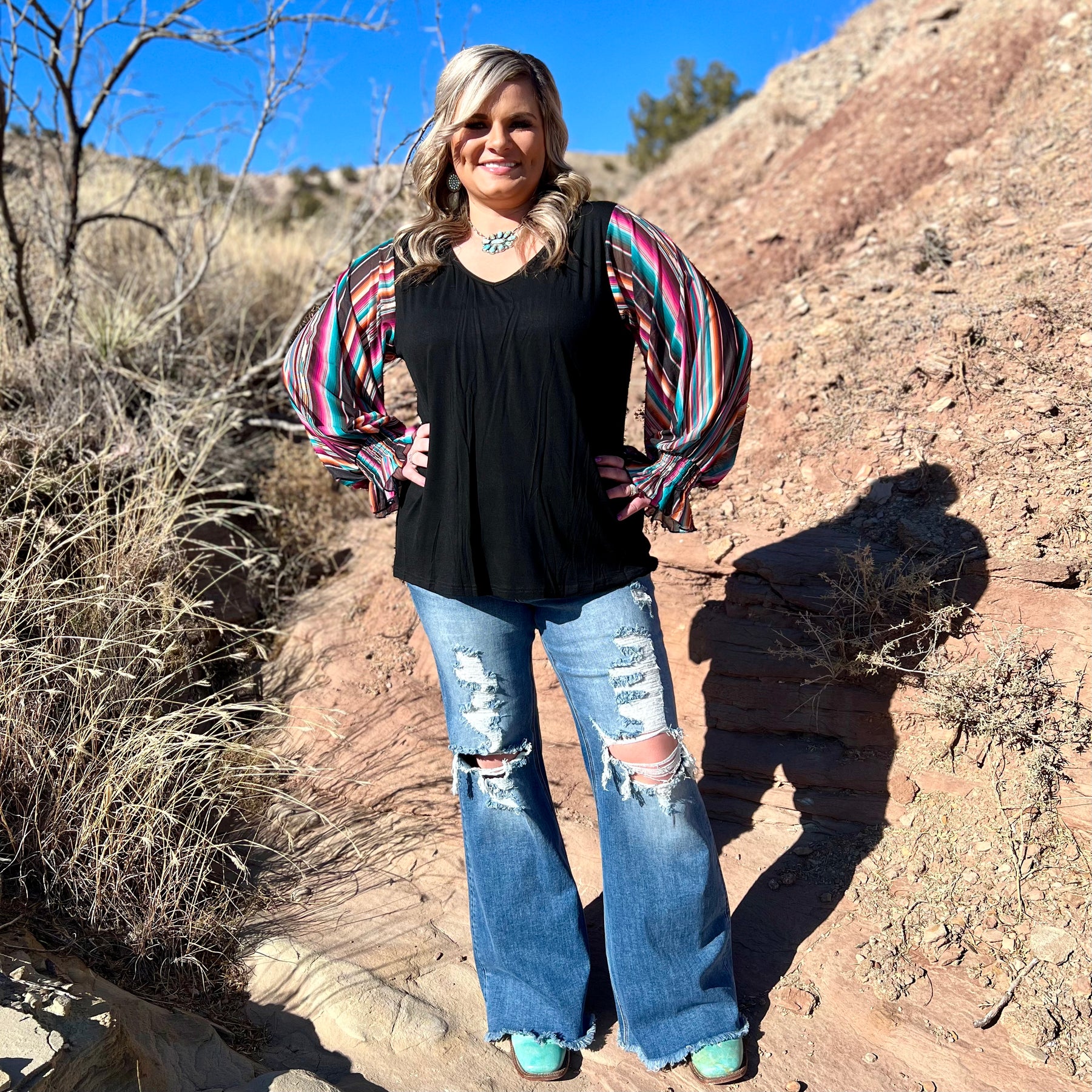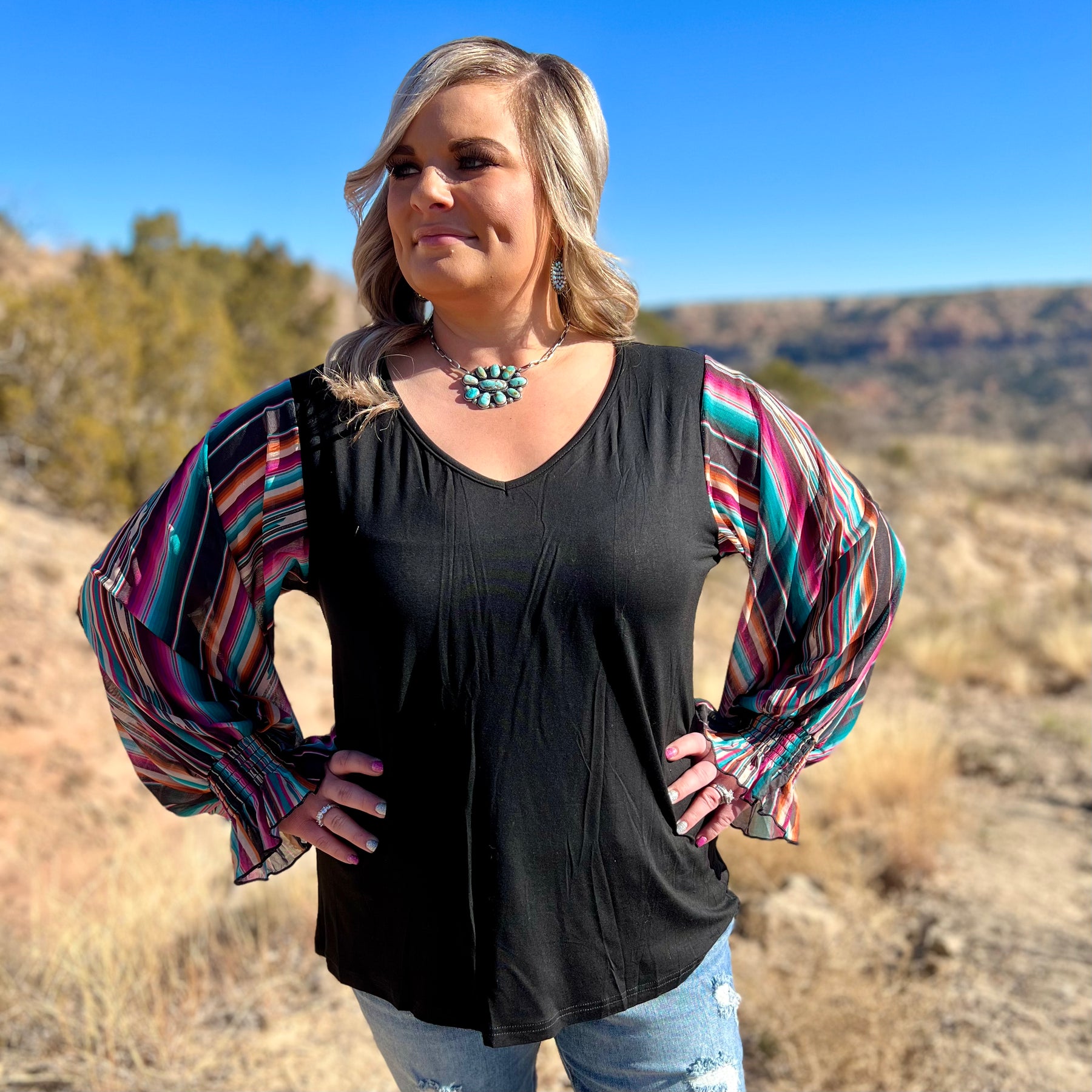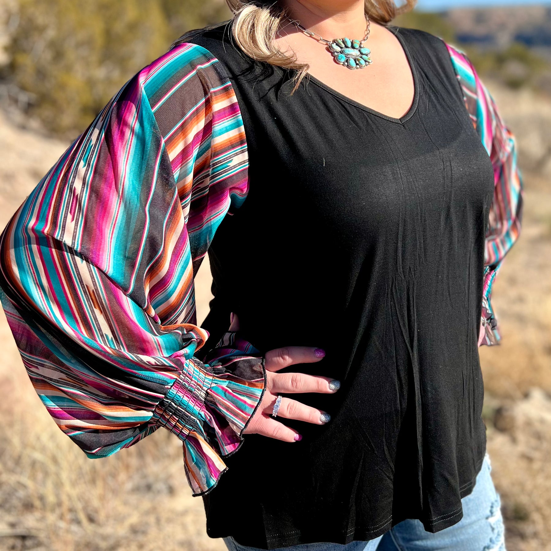 This bubble sleeve top is to die for! These sleeves are full of pinks, oranges, purples, and blues, on a black base! The sleeves are elastic for a comfortable fit! This shirt fits true to size and is so flattering on all boy types!