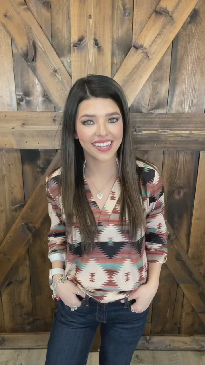 Embrace the spirit of autumn with the Desert Mesa Top, featuring vibrant Aztec-inspired colors and a cozy 3/4 sleeve design. Perfect for layering on crisp fall days, this playful top brings warmth and style to your seasonal wardrobe.