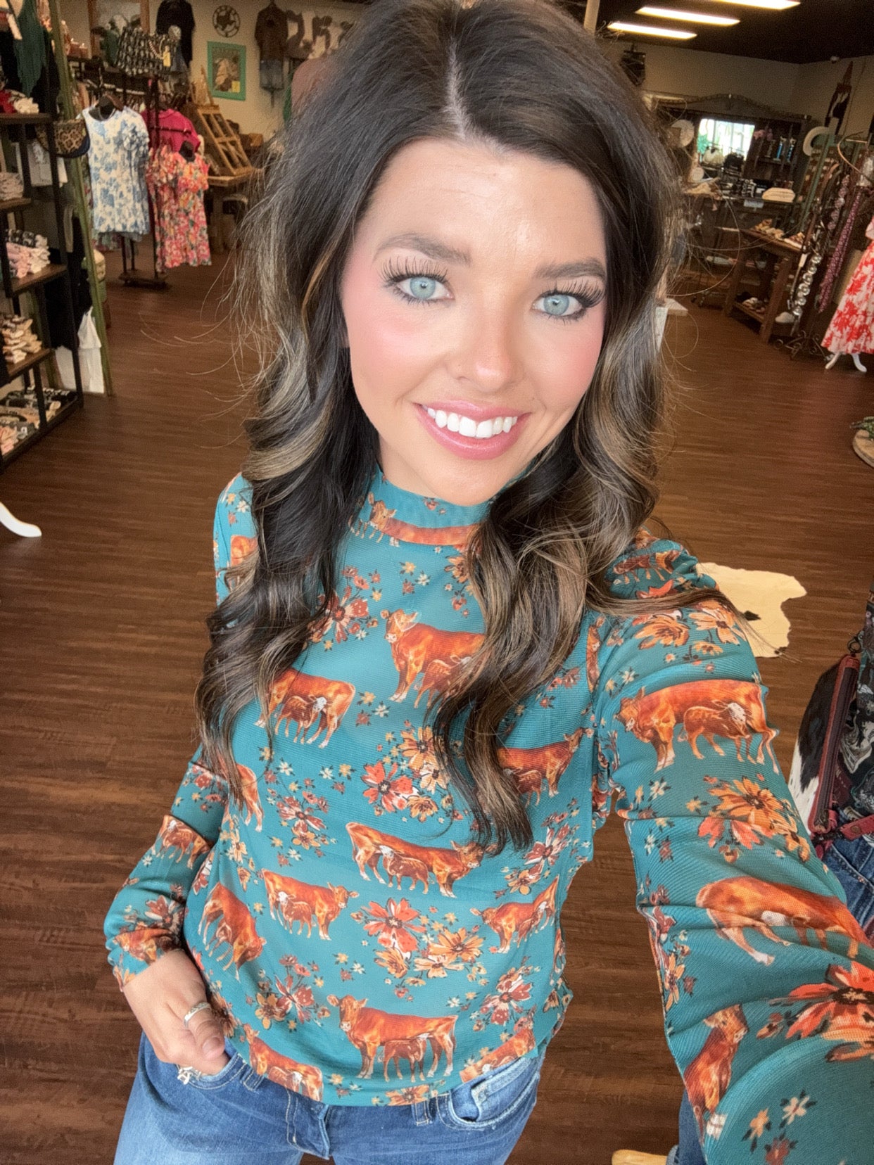 Celebrate cozy farm vibes with this playful turquoise mesh top featuring a charming red momma cow and calf surrounded by vibrant fall flowers. Perfect for adding a touch of country charm to your wardrobe, it’s a fun way to show that home truly is where the herd is. Lightweight and breathable, this top keeps you comfortable while making a bold, cheerful statement.