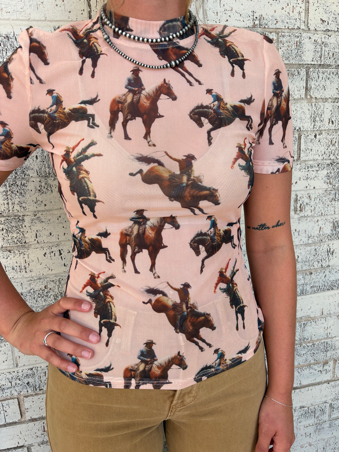 L&B Peach Horse Short Sleeve Mesh Top