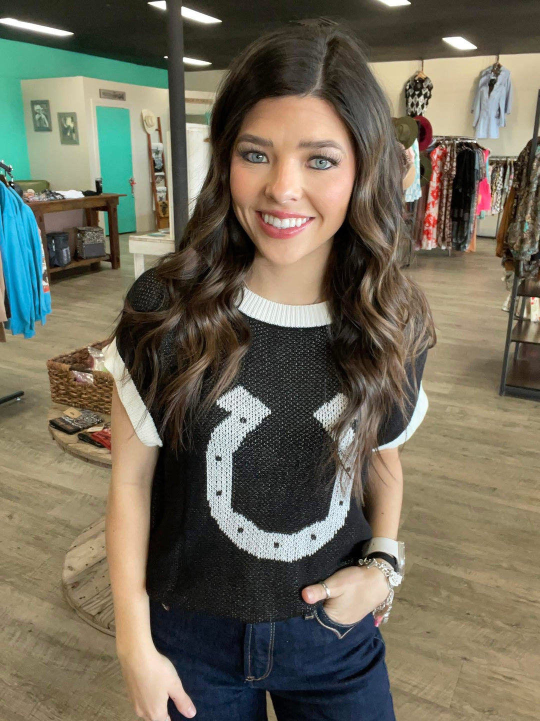 Horse Shoe Contrast Trim Short Sleeve Sweater Top