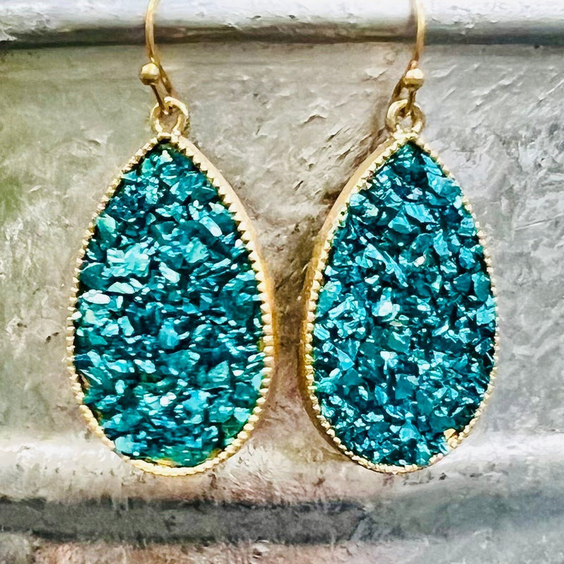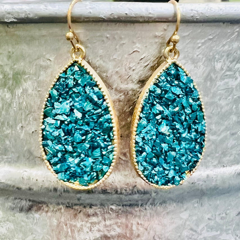 The Bayler Grace Teardrop Earrings are a show stopper. The earrings come in 4 different colors. They are 1 1/4" teardrop with multiple rock gem stones. They are inlayed in a gold tear drop background. They are on a fish hook back.