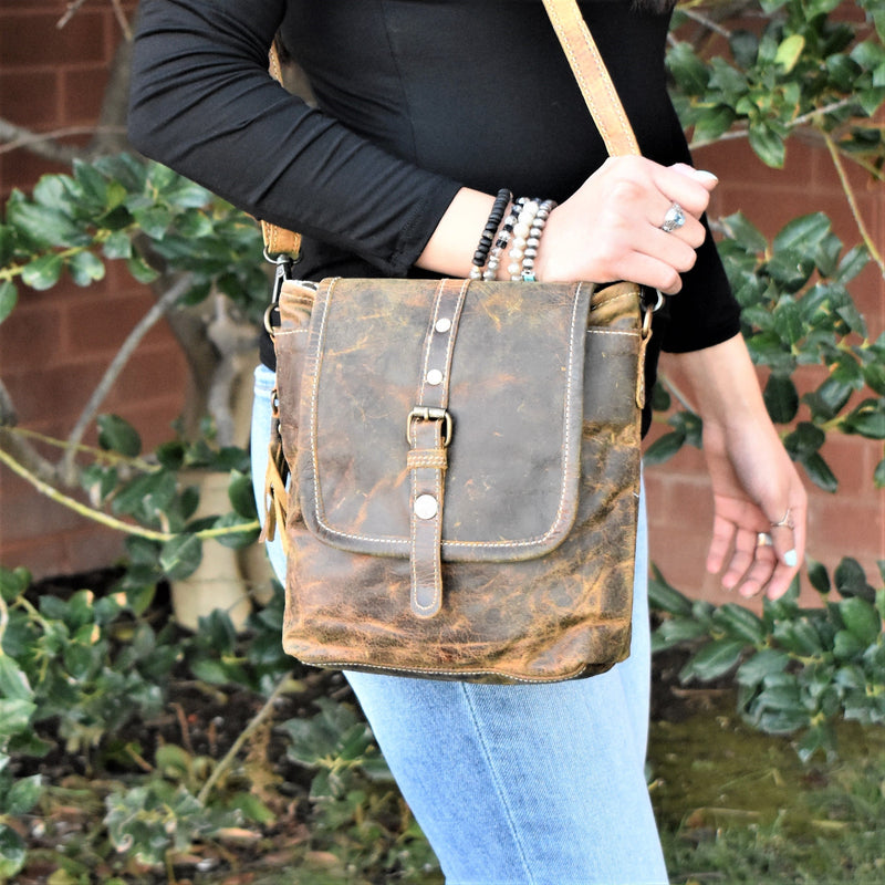 This genuine leather bag in rustic brown leather features a removable crossbody strap, and matches everything! Top zipper closure, with a button snap fold over flap. Back has a zipper pocket as well.