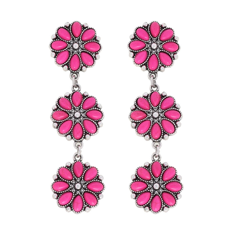 WESTERN 3-TIER TURQUOISE SEMI STONE FLORAL CONCHO LONG DROP EARRINGS IN OXIDIZED SILVER AND COPPER TONE METAL HEIGHT: 3" WIDTH: 0.75" FLORAL FLOWER CONCHO SEMI STONE TURQUOISE OR PINK GEMSTONE DROP COWGIRL STATEMENT SOUTHWESTERN COWBOY RODEO WILD WEST BOHO BOHEMIAN NAVAJO NATIVE AMERICAN SOUTHERN COUNTRY WESTERN DANGLE LONG DROP EARRINGS