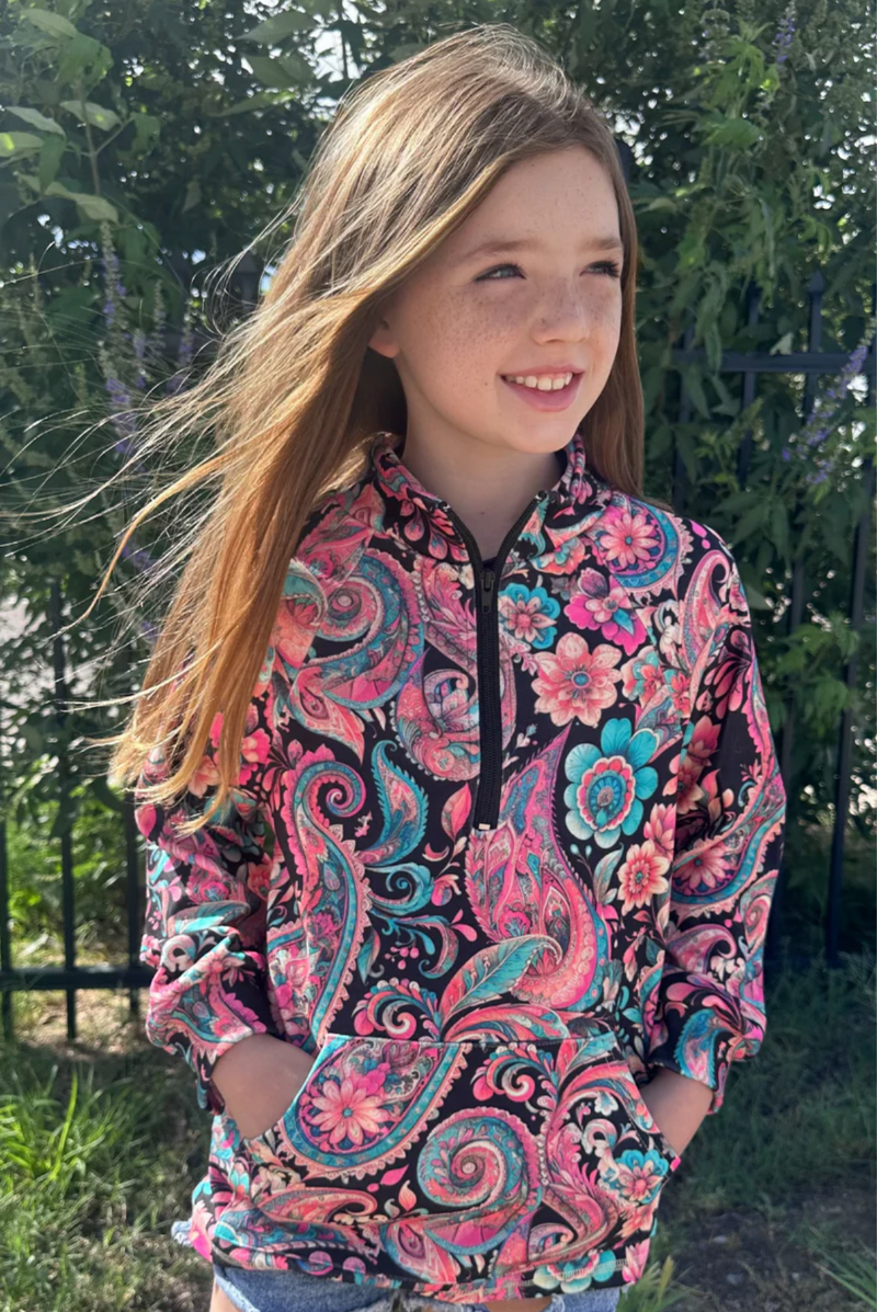 Stay cozy and stylish in the Midnight Bloom Kids Pullover! Featuring a sleek black base adorned with a lively paisley print, this pullover adds a fun twist to any outfit. The handy kangaroo pocket keeps little hands warm and treasures close. Perfect for playful days and cool evenings, it’s a must-have for your child’s wardrobe.