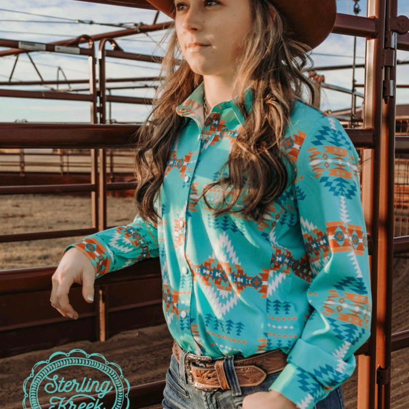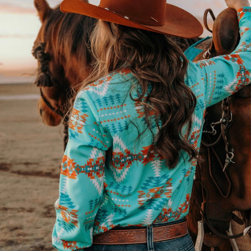 We all need a good button up! Here you have the perfect combo of blues and oranges with a splash of white and tan on a turquoise base. This button down is made of a lightweight and breathable fabric, to keep you cool and dry! It also offers a black pearl snap closure, featuring 7 buttons. In this, straight sizes run true, plus should size up.