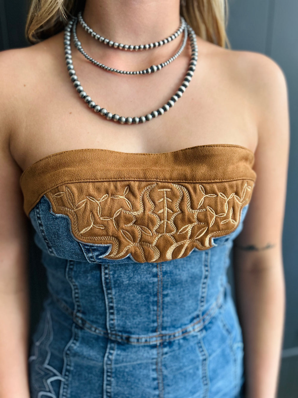Stone Wash Boot Stitch Embroidery Patch Strapless Denim Dress