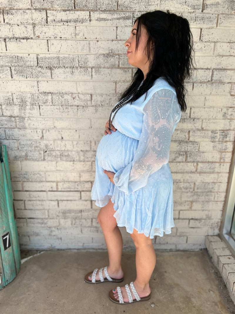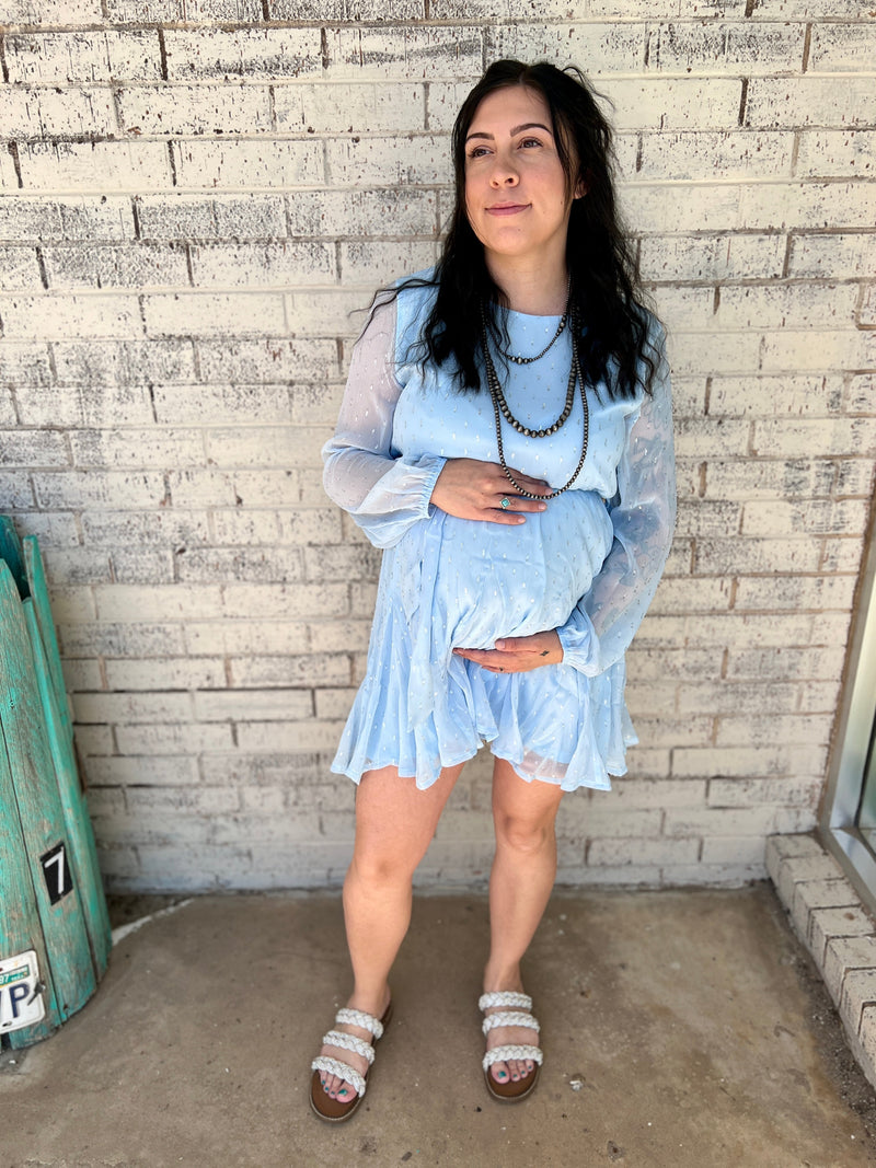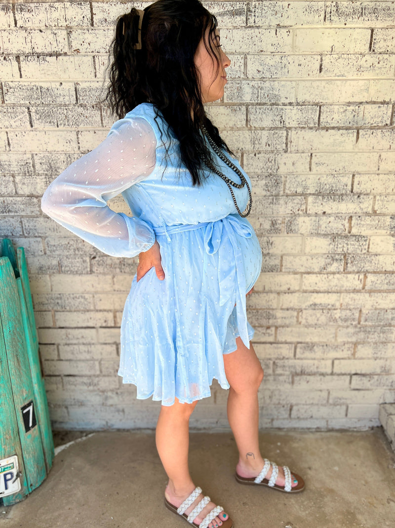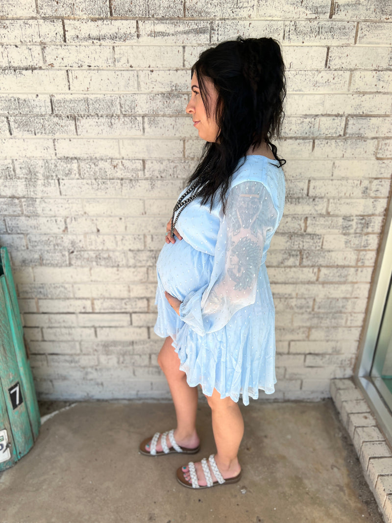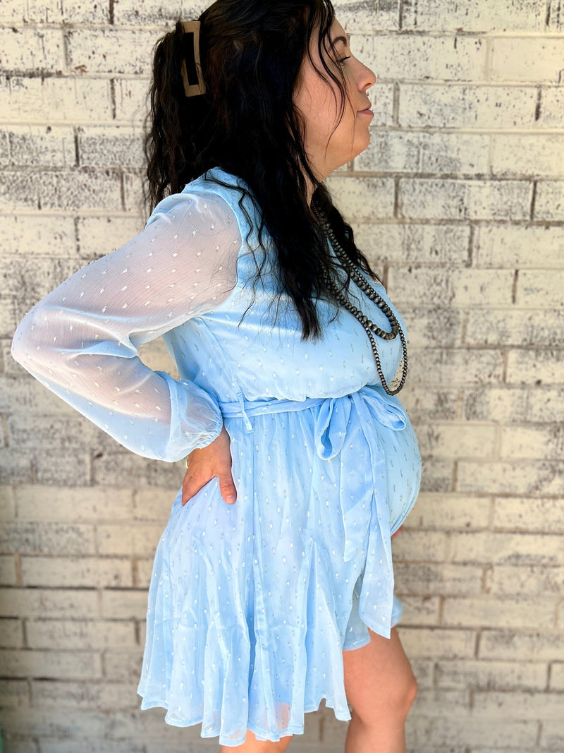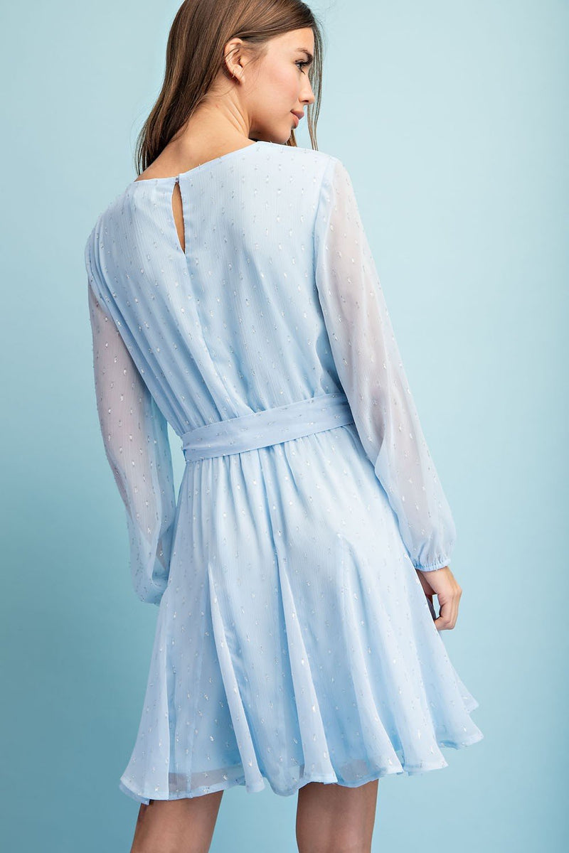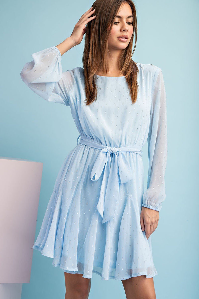"Turn heads in our Innocent Wink Dress. This periwinkle dress boasts a playful long-sleeve design and a flattering tie waist, silver sparkle details,  creating a mini dress that is both sweet and sassy. Perfect for a night out with the girls or a special date!"