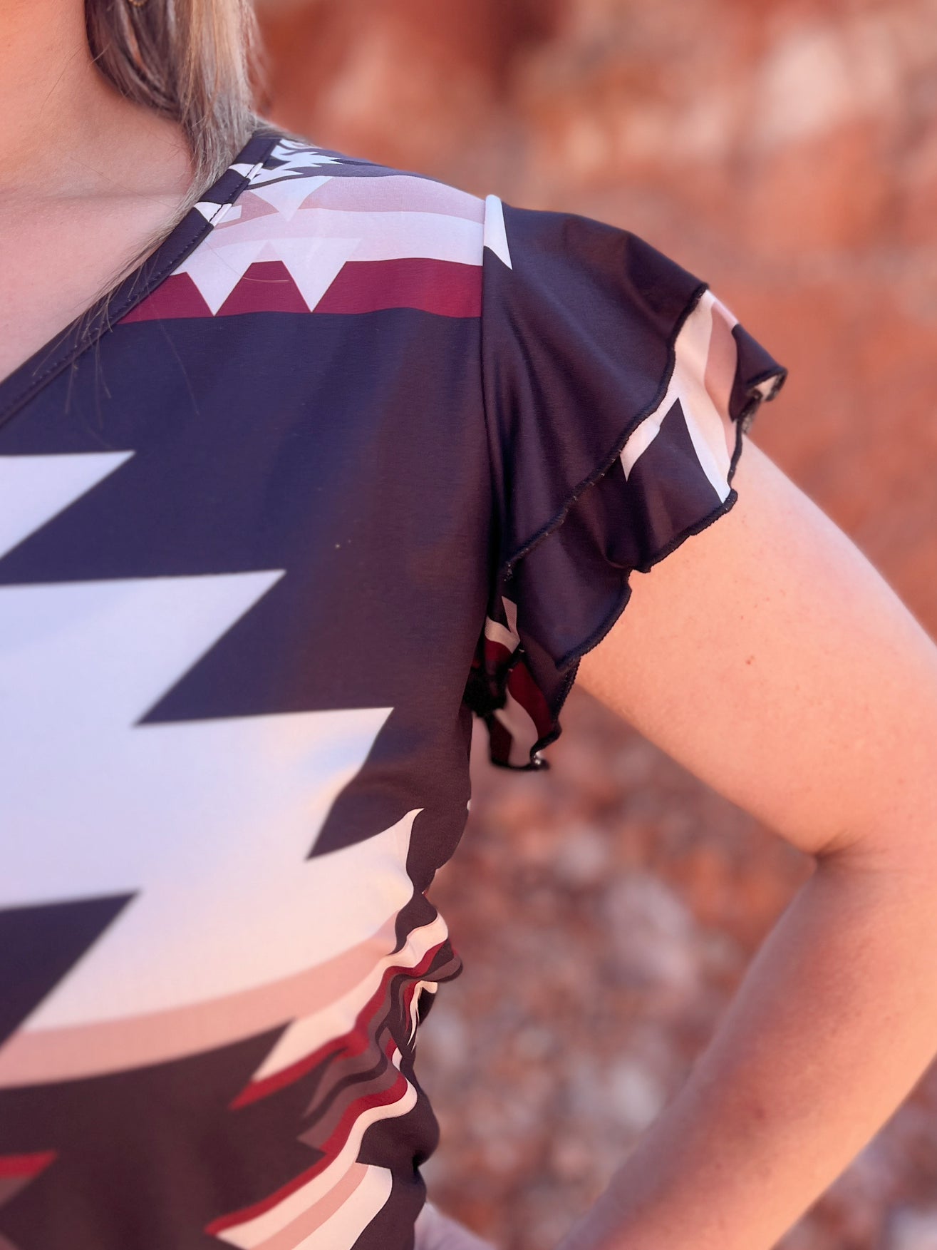 Get ready to channel some serious boho vibes with The Graceland Top! Featuring ruffled sleeves and a playful aztec pattern, this top is both cute and stretchy for ultimate comfort. Perfect for a day out with friends or a fun night out, this top will be your new go-to for adding a touch of quirky style to any outfit!