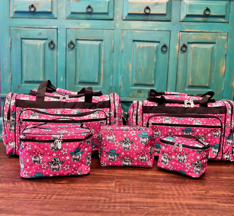 The Disco Cowgirl Large Duffle Bag is sure to impress, with its multi bright pink background and multi colored cowgirl hats, these bags have tons of character.  The multiple compartments come in handy so you can store all your essentials in one stylish and convenient bag. Perfect for any adventure.
