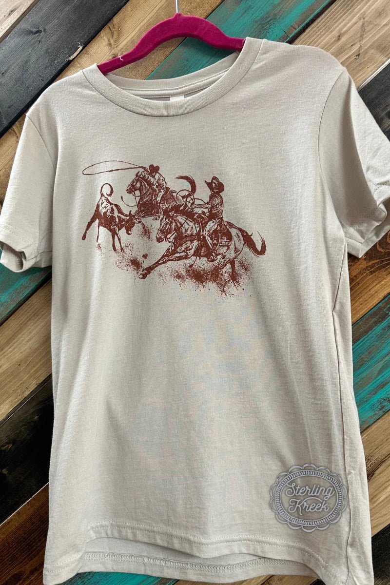 Yeehaw! Wrangle your little one into this playful Team Roper Tee! The tan base is adorned with a quirky team roper design, perfect for your little cowboy or cowgirl. Saddle up and add some fun to your baby's wardrobe!