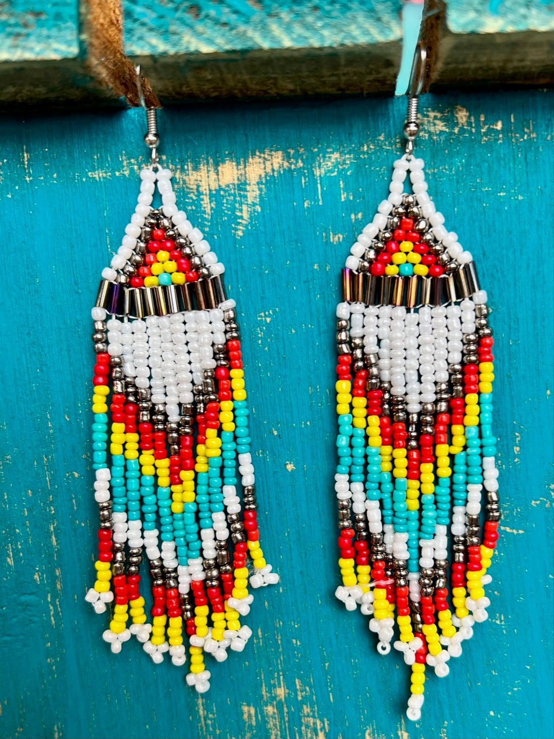 The Kiowa Seed Bead Earrings are a multi bead, multi strand, Aztec design dangle design. The colors really stand out and would add tons of color to any outfit. The total length of the earrings a 3 1/2".