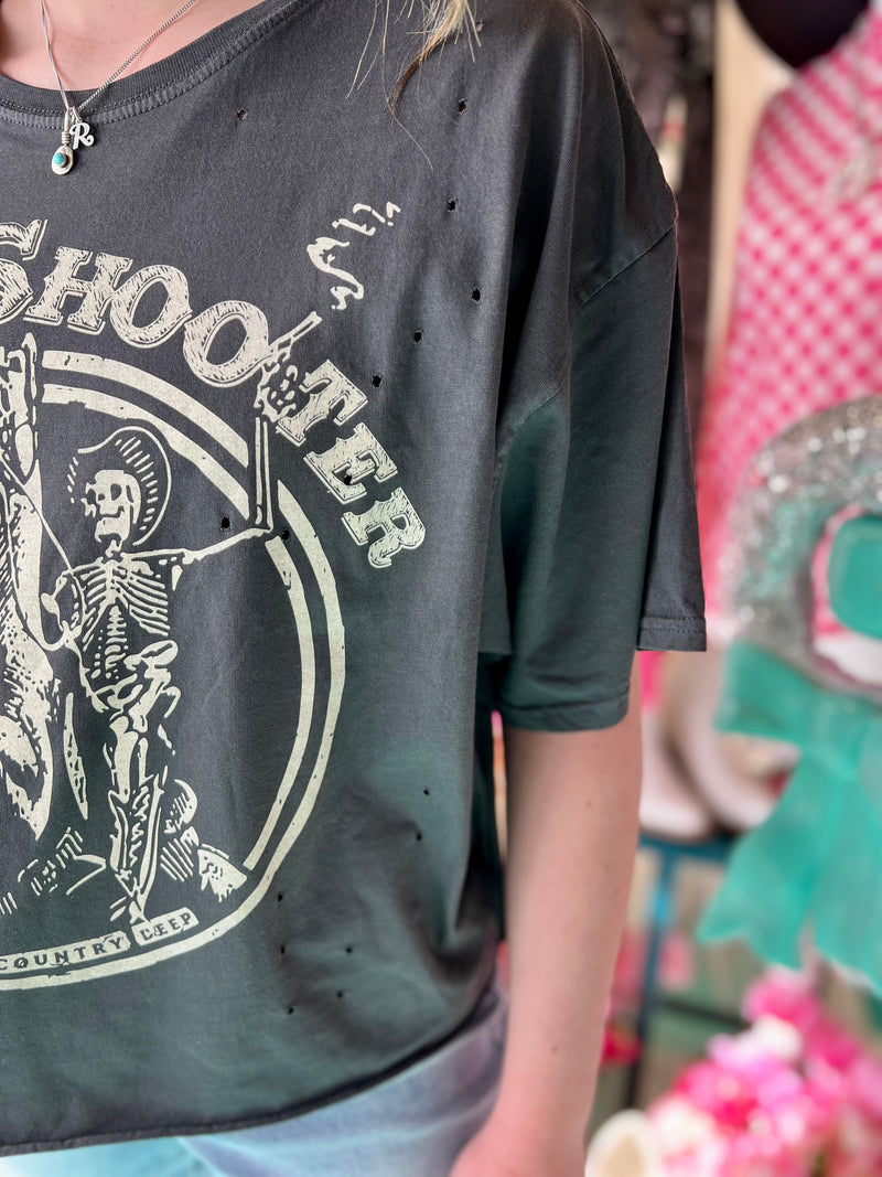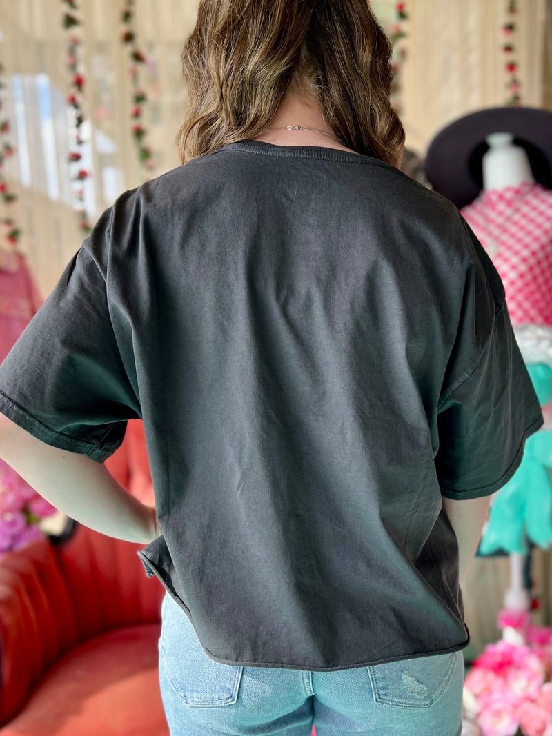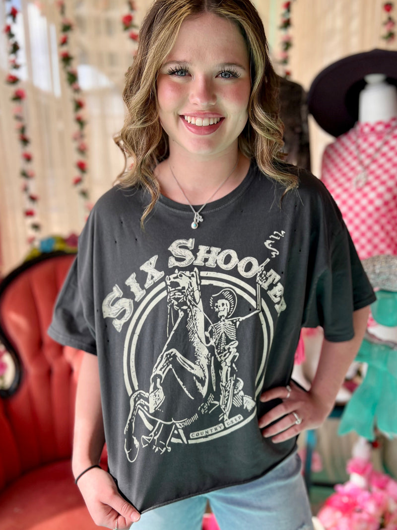 Introducing the holy grail of vintage tees - our Six Shooter Holy Cropped Tee! This unique design features a vintage cowgirl graphic and is crafted with a vintage black fabric. Short sleeved and with a cropped fit, it's got that perfect cool and effortless look. Get ready to shoot up your style game with this holy tee!
