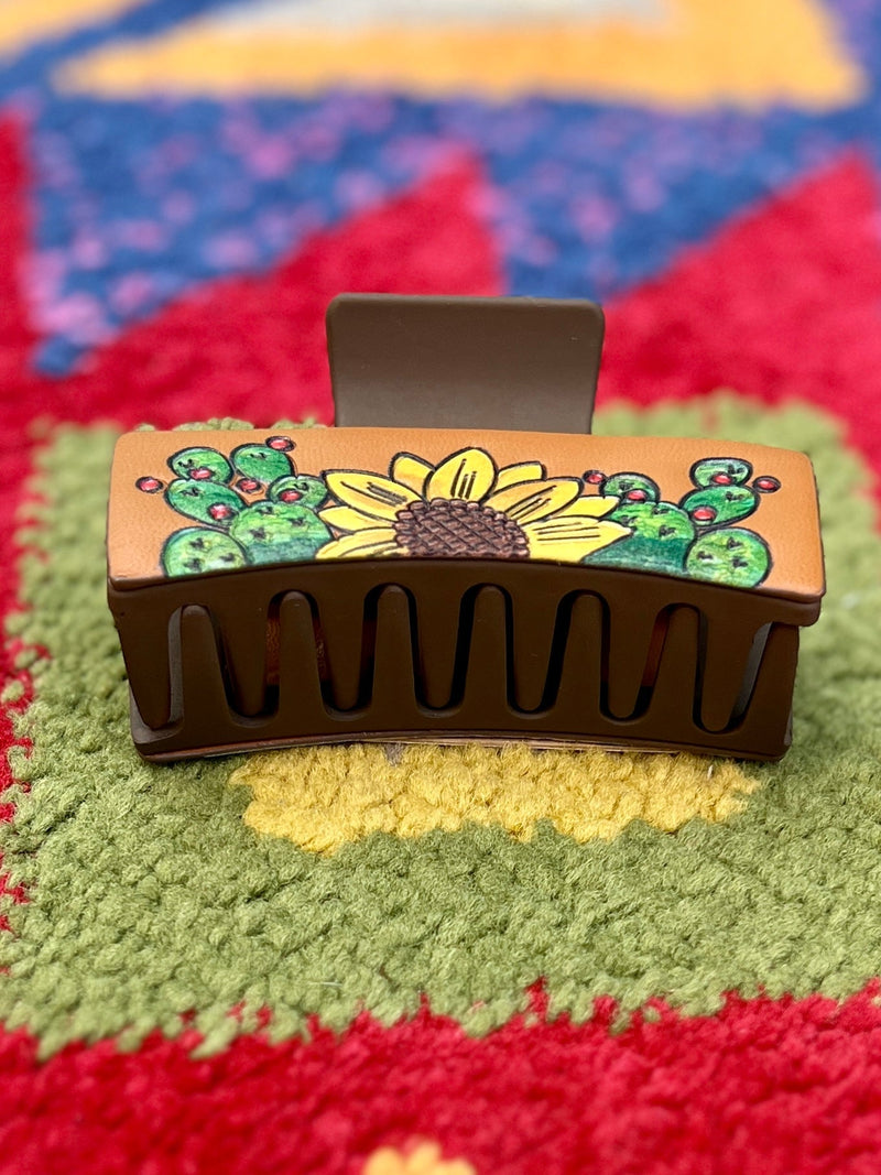 Clip your hair with this Souther Grown Claw Clip! This brown leather claw clip features an eye-catching Sunflower  & Cactus print for a fun, unique look. At 3 1/4"L X 1"W, it's perfect for holding hair in place with style.