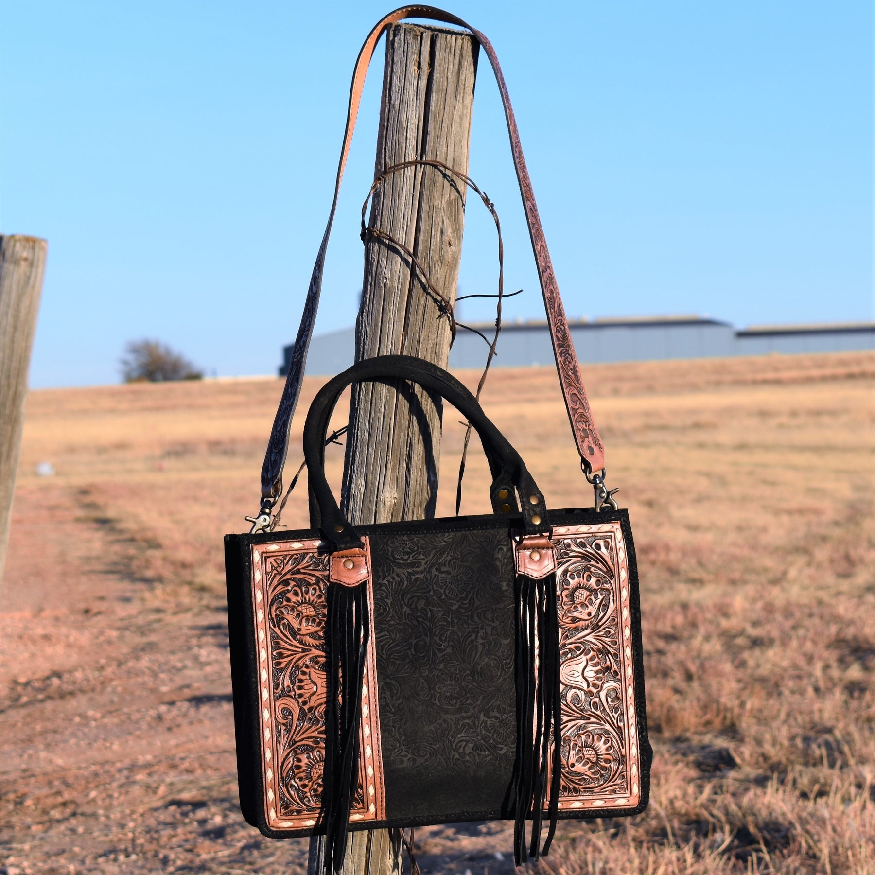 Absolutely beautiful black embossed suede and tan tooled leather purse! The bag has a large zipper closure pocket, inside zipper pocket, two open pockets, and back that is capable for carrying concealed. Comes with a removable tooled leather strap. Front tooled panels have an ivory lacing detail and suede tassel by the handles.