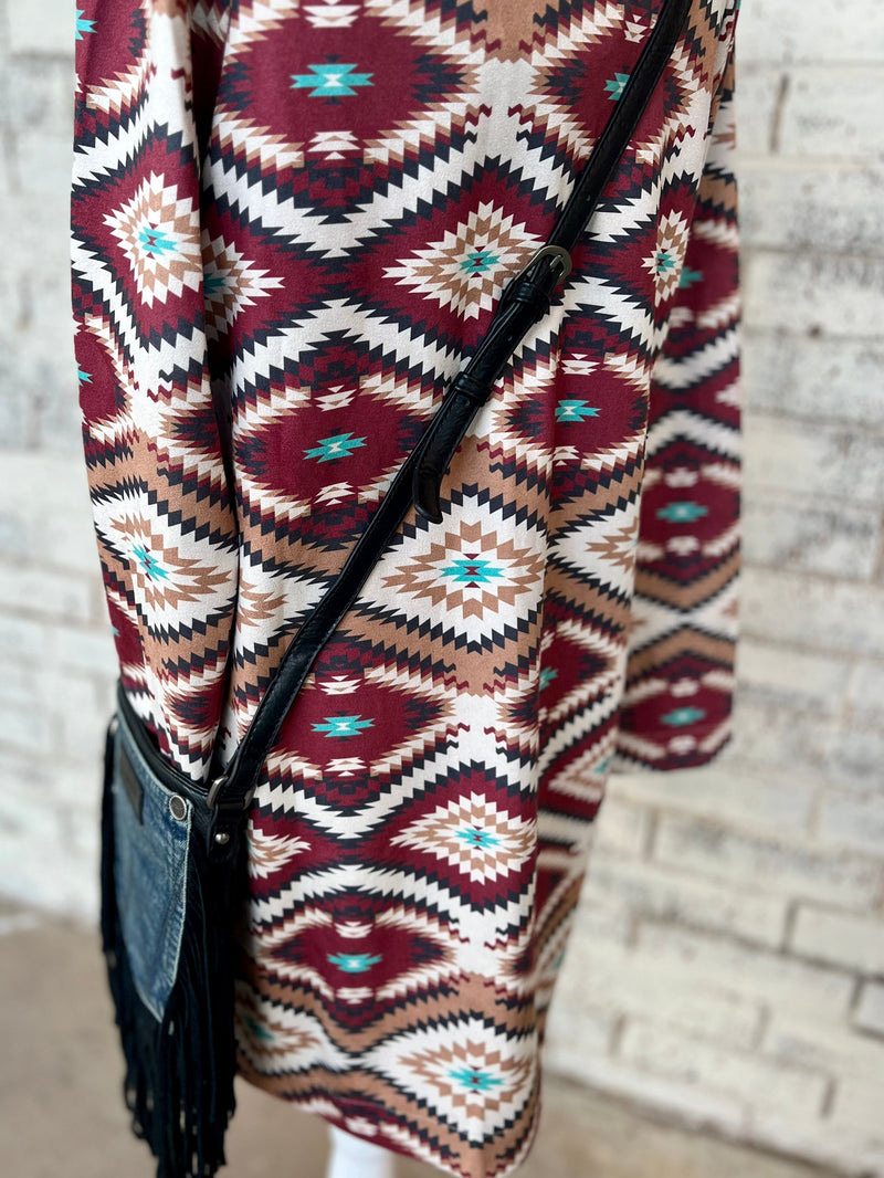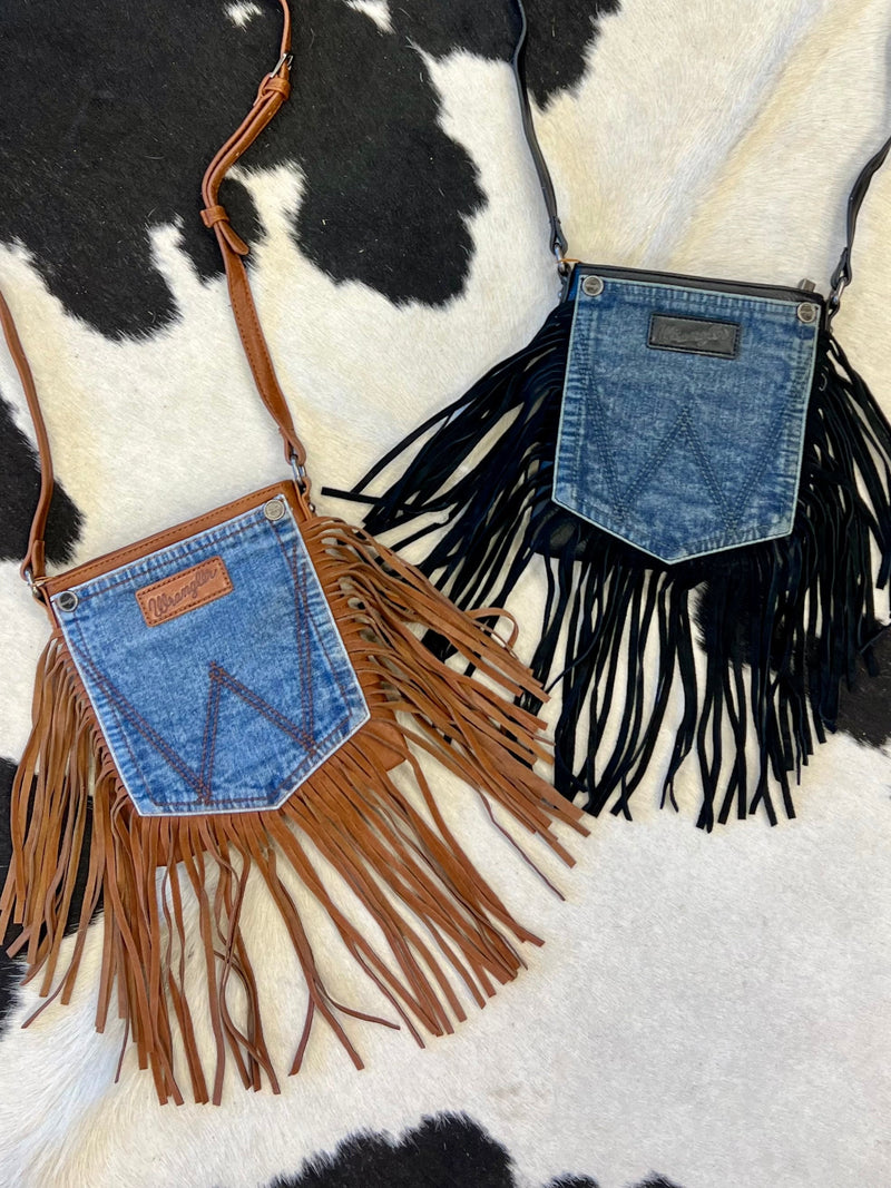 The Original Wrangler Pocket Black Crossbody is an exquisite accessory crafted from Original Wrangler Black Denim and black leather. This elegant piece also features brown leather fringe and 54” adjustable crossbody strap, perfect for convenience and comfort. Dimension: 7"W X 8"H