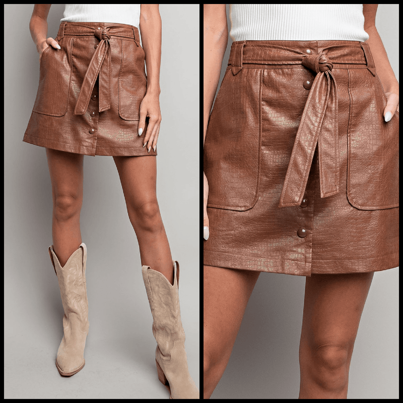 "Add a playful edge to your wardrobe with The Rue Cremieux Skirts! Available in black or brown with a pleather finish, these mini skirts feature a tie waist and front pockets. Perfect for any occasion, the snap button front adds a touch of fun to your style. (But seriously, these skirts are a must-have!)"