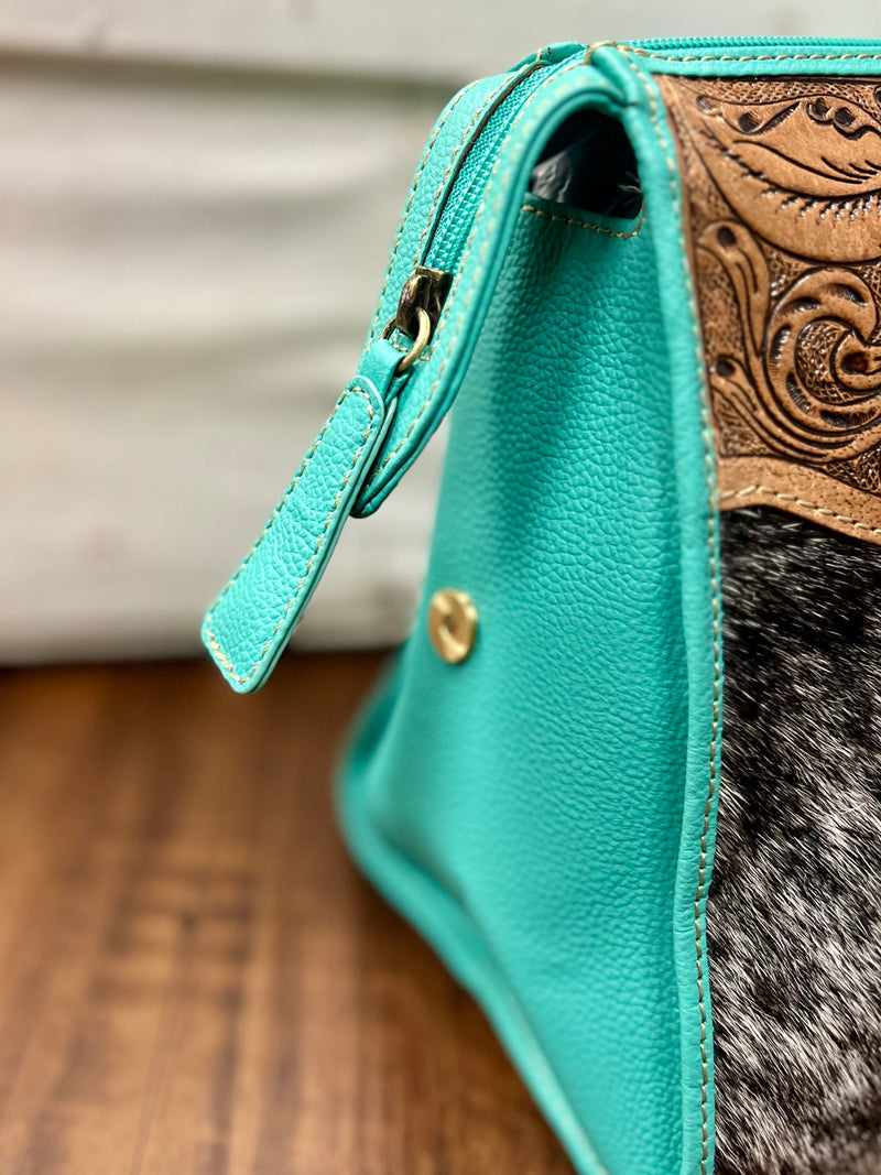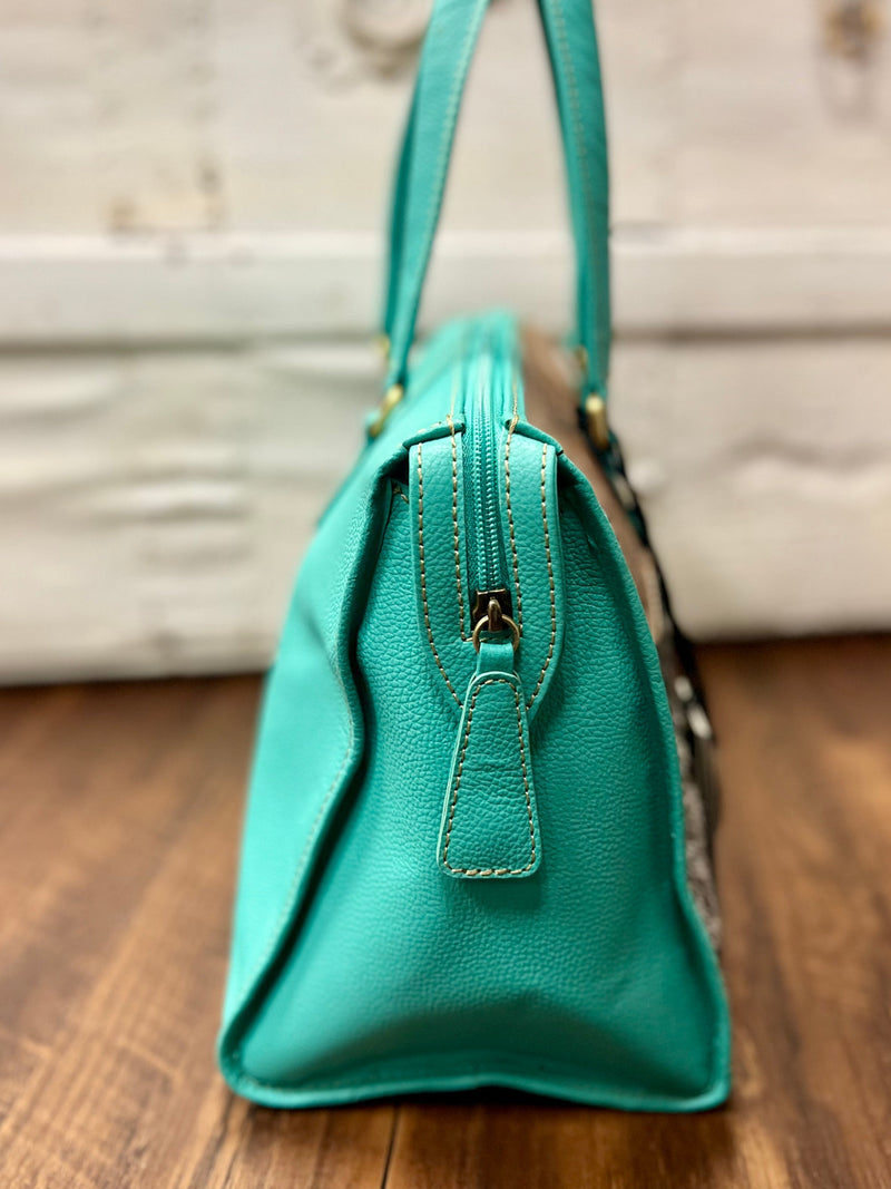 Spice up your style with the Tylersburg Hand Tooled Turquoise Handbag! This cow print and hair on hide bag is hand tooled with genuine leather and features a stunning turquoise color. Upgrade your accessory game and stand out from the herd.