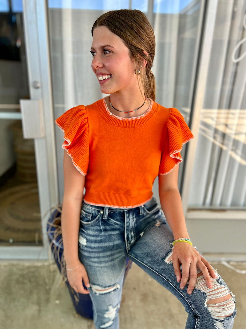 Look no further for the perfect wardrobe staple! This sunkist orange and white cropped sweater is sure to be a hit. With ruffle sleeves and contrast threads, you'll be turning heads from left to right! Made with 49% Viscose, 28% Polyester, and 23% Nylon, this stylish sweater looks great and feels even better! Make your mark in this oh-so-cute cropped sweater!