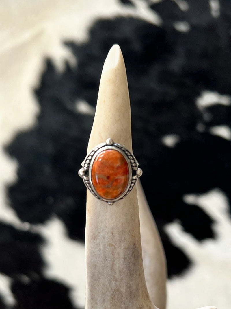 This exquisite  size 6 Navajo ring is crafted from sterling silver and features a single round-shaped genuine ss sponge coral stone. The coral displays a fascinating  orange hue, sure to add a touch of sophistication and elegance to any outfit. Indulge in the luxury of this one-of-a-kind piece. Handcrafted by Navajo from Gallup New Mexico.