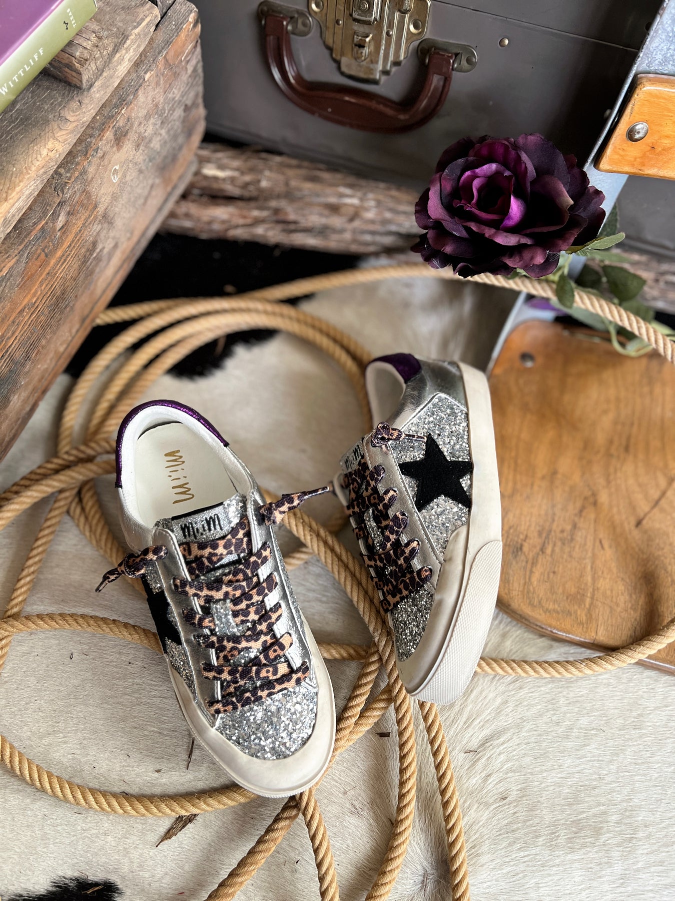 Elevate your sneaker game with MIIM Burgundy Game Day In Sparkles. These bold lace-up sneakers feature a silver star design, glitter details, and a slip-resistant rubber outsole. Designed for comfort and style with a Memory Tech memory foam insole. Upgrade your street style with this ethical and sustainable choice!