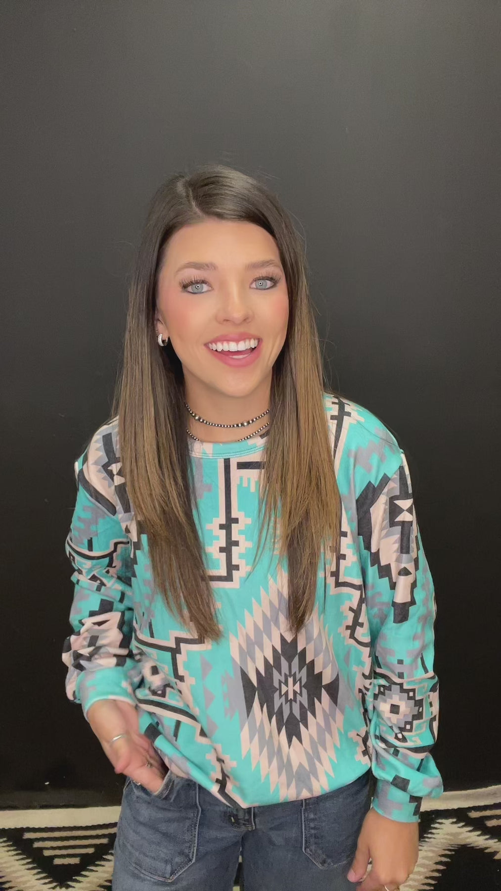Brighten your wardrobe with the Blue Ridge Top, featuring a vibrant turquoise base adorned with a chic gray, black, and white Aztec pattern. Crafted from a fresh, must-have fabric, this top combines comfort with eye-catching style, perfect for adding a playful pop to any outfit.