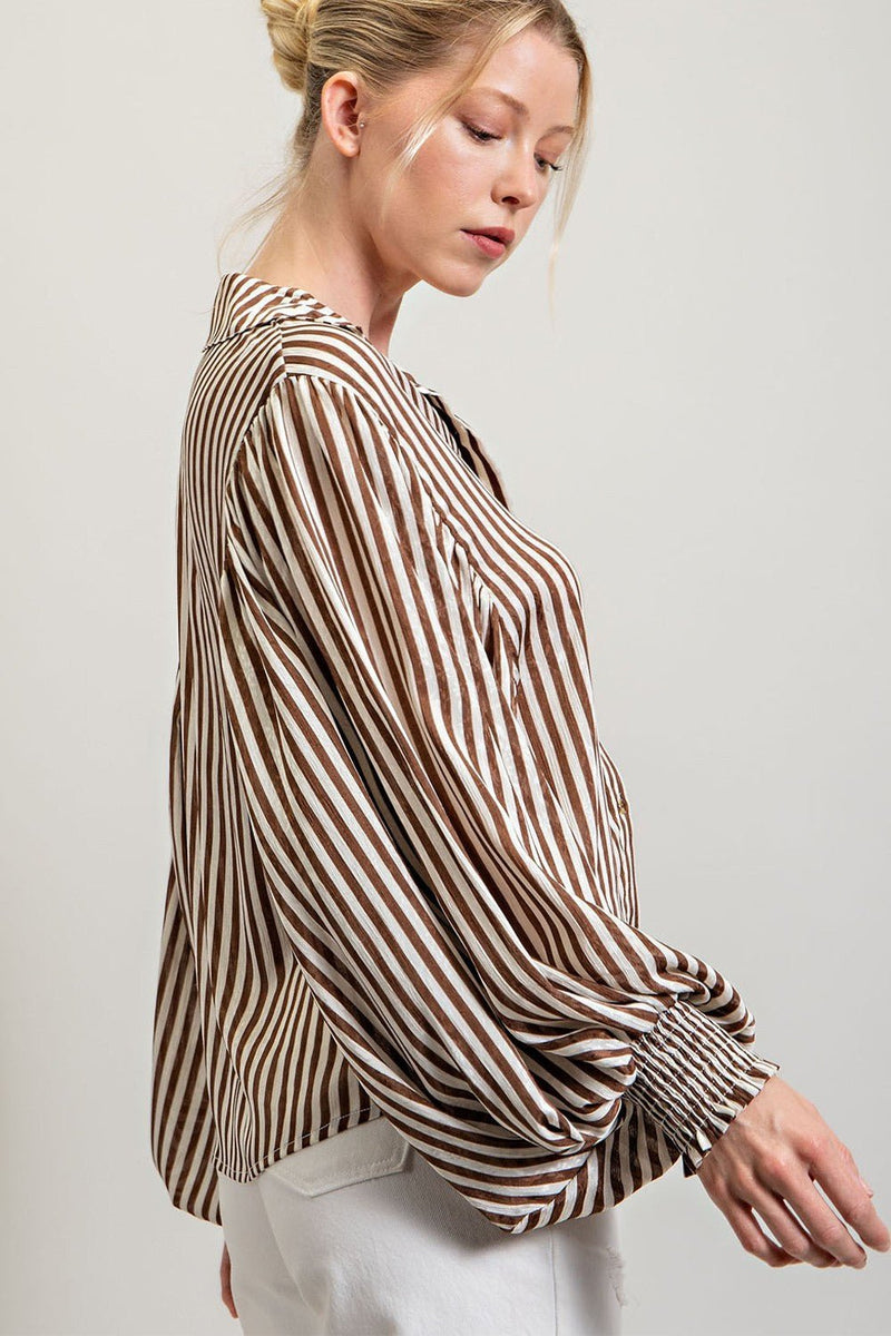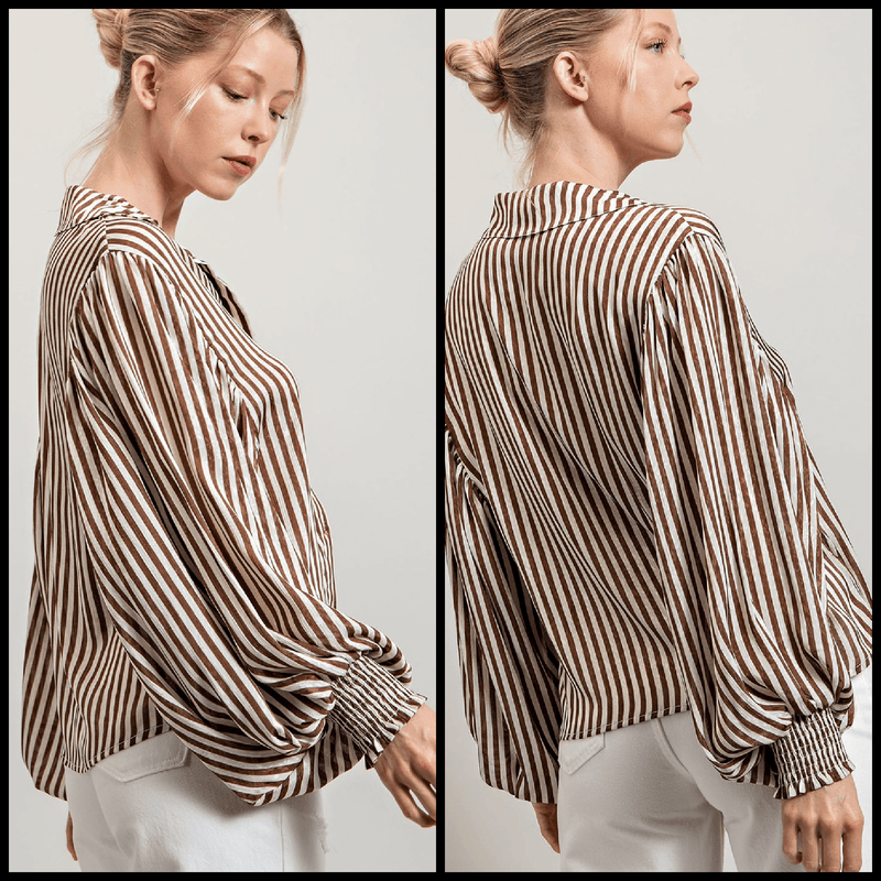 "Get ready to slay in our chic Brown Striped Top! With its trendy bubble sleeve and stylish v neck, this blouse adds a touch of playfulness to your wardrobe. Perfect for a day out or a night on the town, this brown and white striped top is a must-have for any fashion-forward individual. Elevate your style game now!"