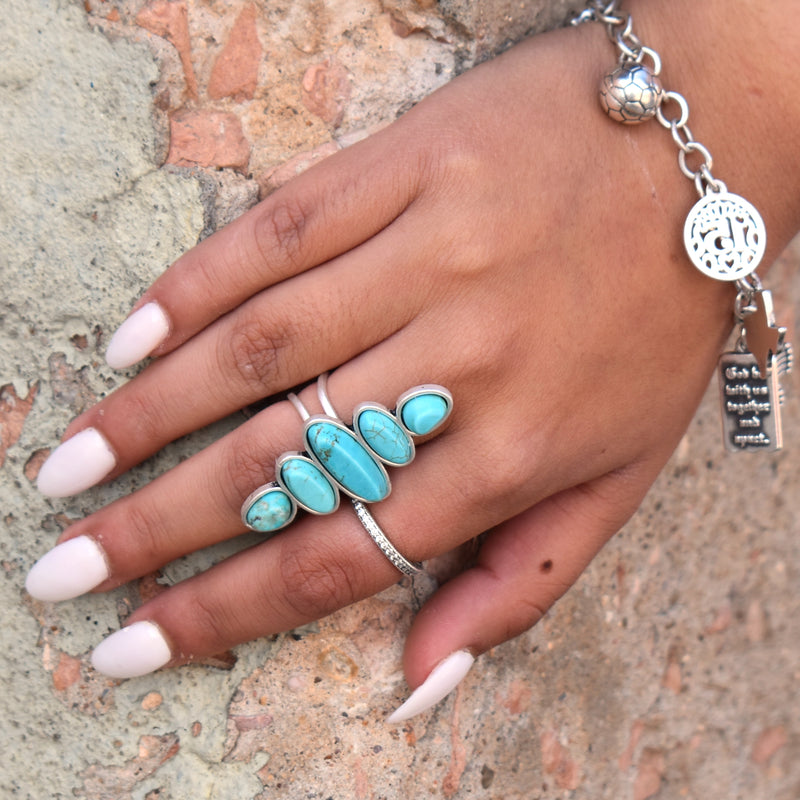 Five stone turquoise statement ring with adjustable silver coated bronze double band.