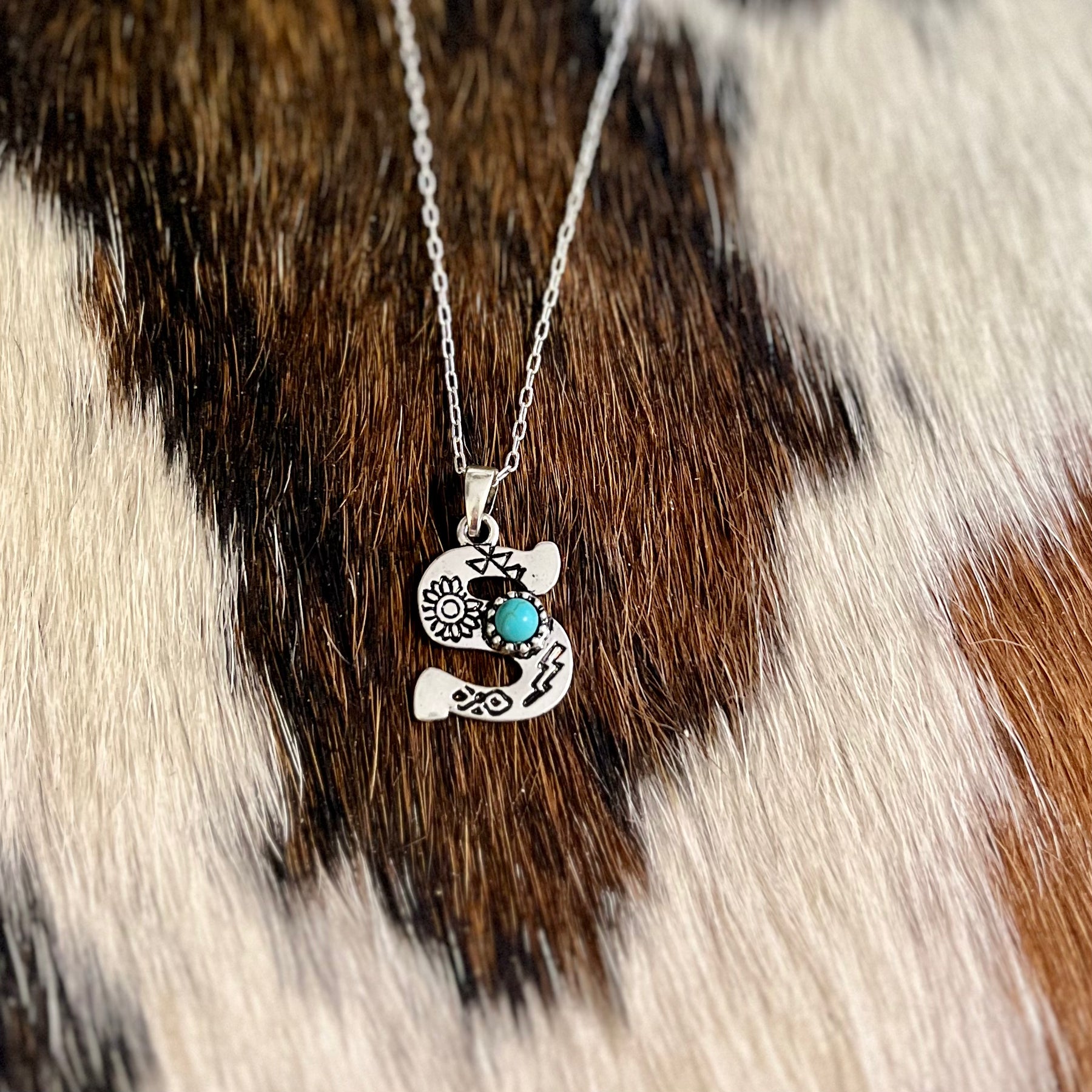 Personalize your look with a letter necklace! One of the latest western fashion trends. These high polished western style with aztec and flower textured monogram alphabet pendants are literally made for YOU! The turquoise colored stone on each one is the finishing touch!