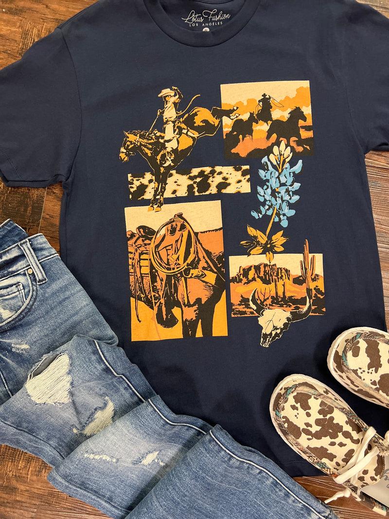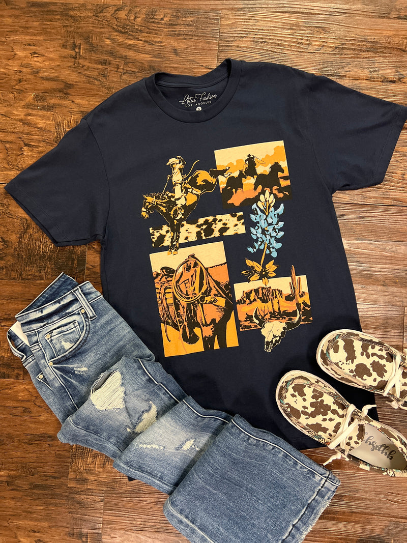 Get ready to explore the wild west in style with our Western Wonders Graphic Tee! This navy, short sleeve shirt features a unique collage design with a playful twist on classic western imagery. Made from 100% cotton, this tee is not only comfortable, but also full of personality. Yeehaw!