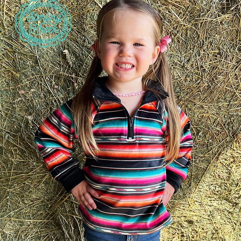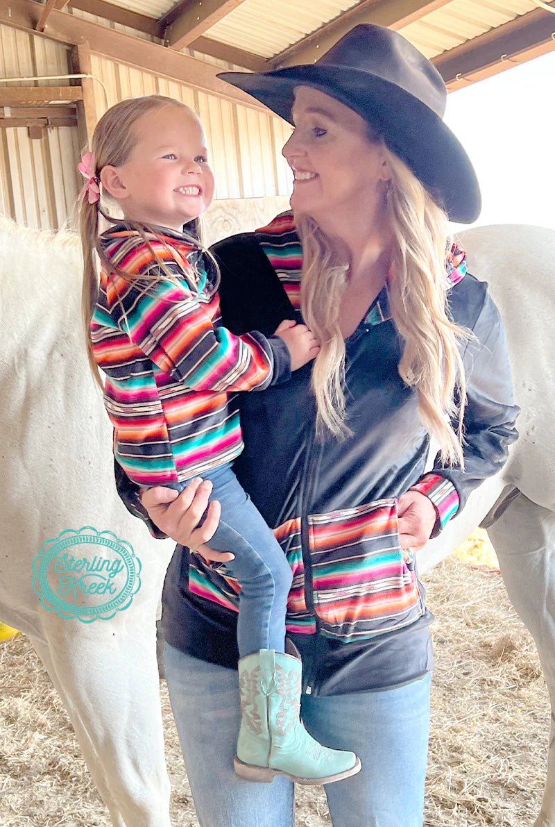 This pullover with a half zipper up to the collar is perfect for your little one! So soft and easy on and off. The magnificent blend of colors makes it so easy to pair with every outfit. The serape adds a little punch of western to her look! Find the matching piece in adults to make a mommy and me matching set! We are wild about this duo!