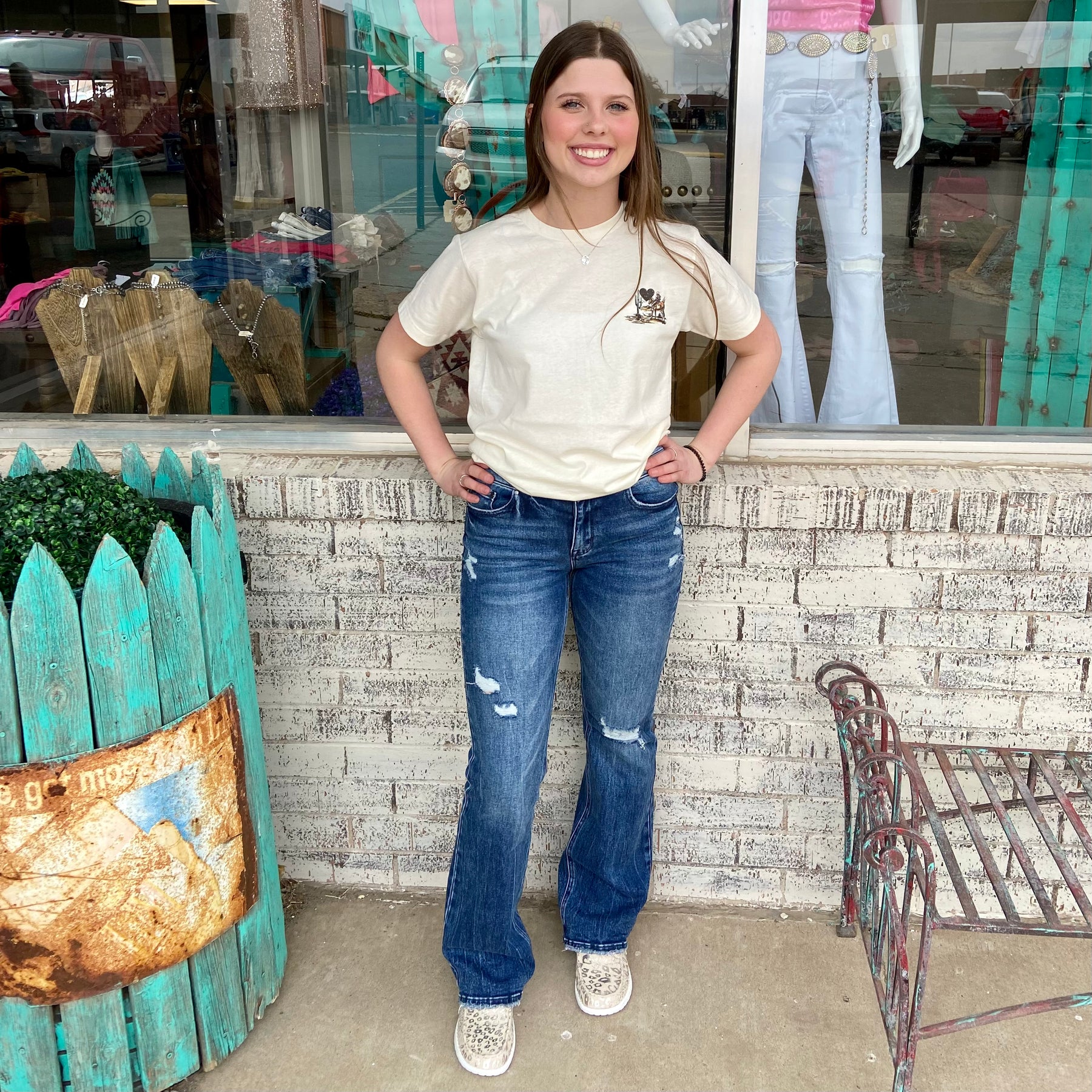 Experience a daring, modern twist on your classic denim with our Dark Washed High-Rise Classic Bootcut Jeans. Featuring a flattering fit, double button wide waistband, and country western vibes, you'll be ready to take on your everyday adventures with confidence. Dare to be bold and take a risk!
