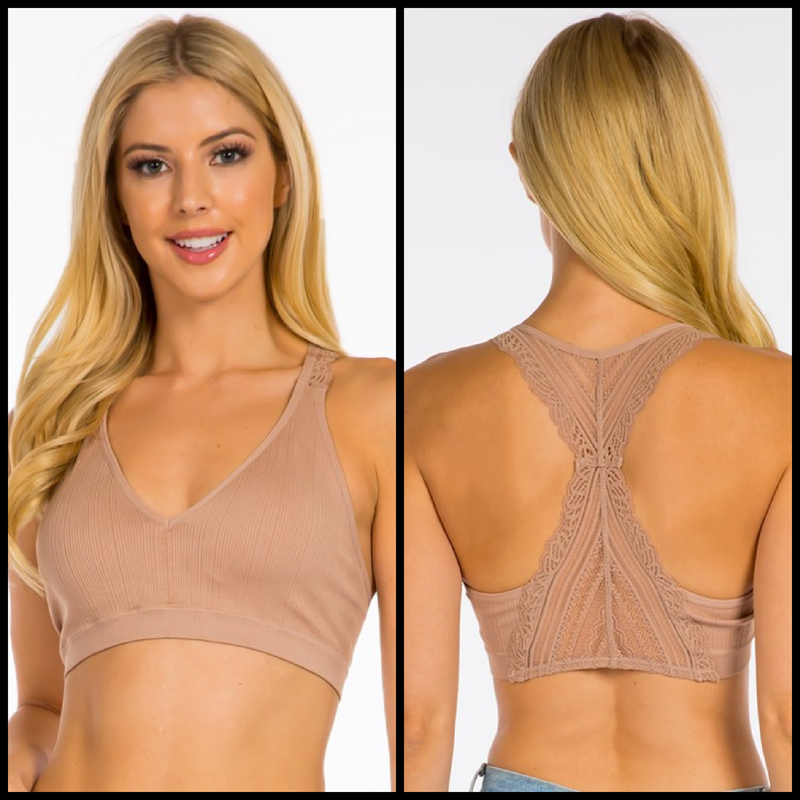 Cute all lace racerback bralette, pull-over style, deep v-neckline, lined, great support, soft, comfy, removable bra pads, and the perfect amount of stretch. 90% Nylon, 10% Spandex S/M 32A,32B-34A-34B M/L 34A-34B-36B-36C