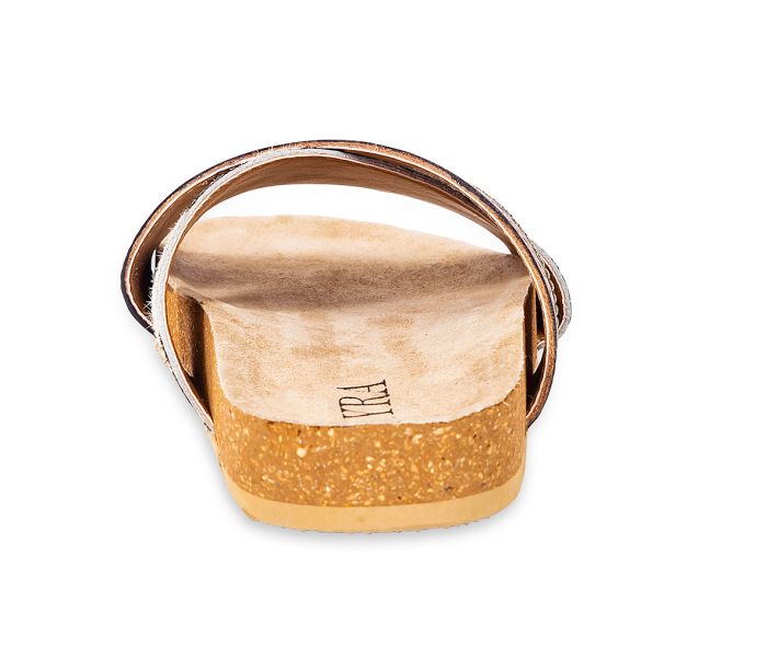 You’ll step out in sure style with these beautiful slides! Their remarkable cross-strap design features hand-tooled leather in warm caramel and ebony and luscious hair-on hide. The thick cork platform will provide day-long comfort along with the comfort grip sole.