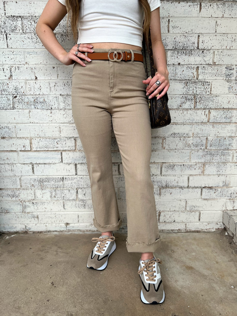 Ditch the jeans and slip into these soft, stretchy, and Khaki colored Trousers. The high rise and wide leg provide a comfortable fit, with a button closure for added style. Perfect for any occasion, these ankle-length pants are the one good reason to add a dressy or casual look to your wardrobe.