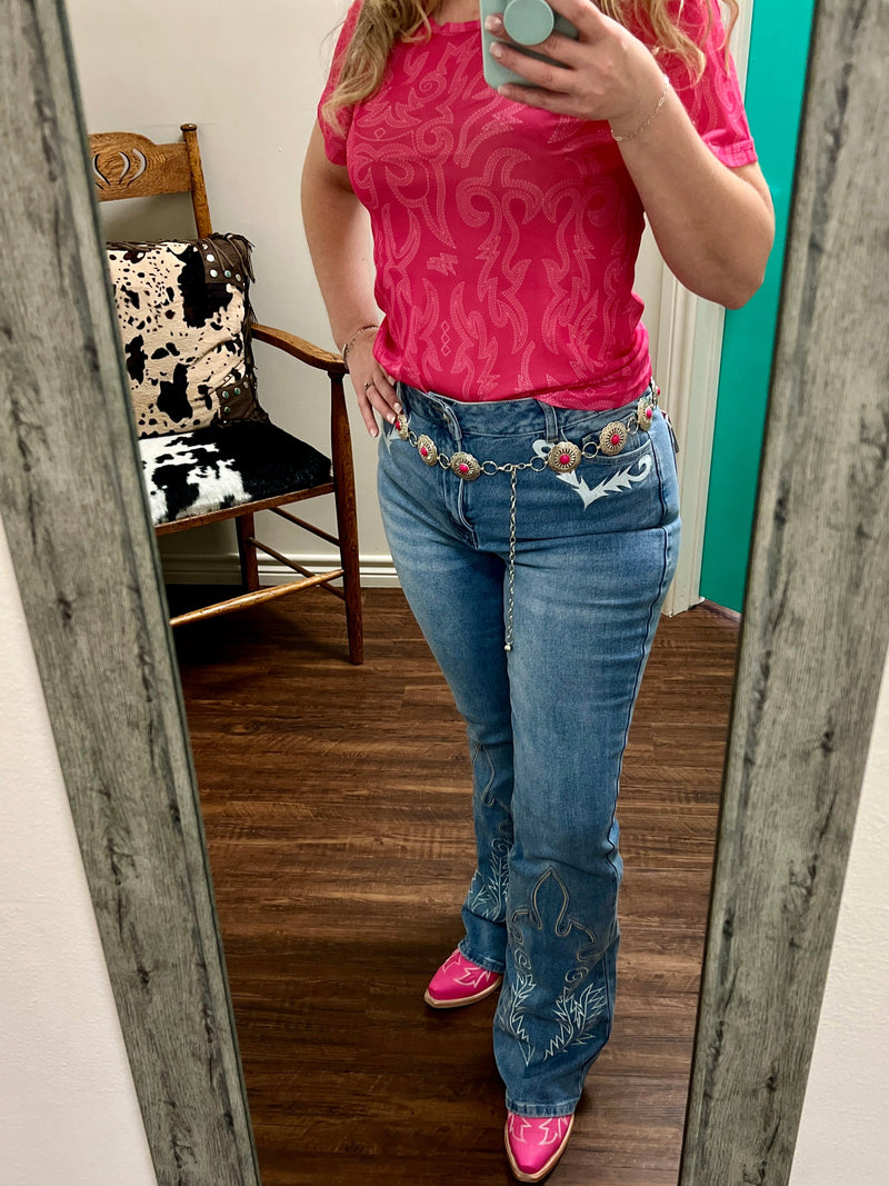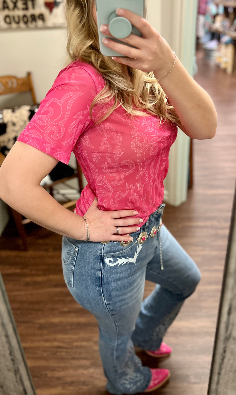 This pink plus mesh top is perfect for the wild and free gal! Show off your adventurous side with the cream boot stitching design, making you the trendsetter of the town. Let's go, girls! (No instructions revealed)