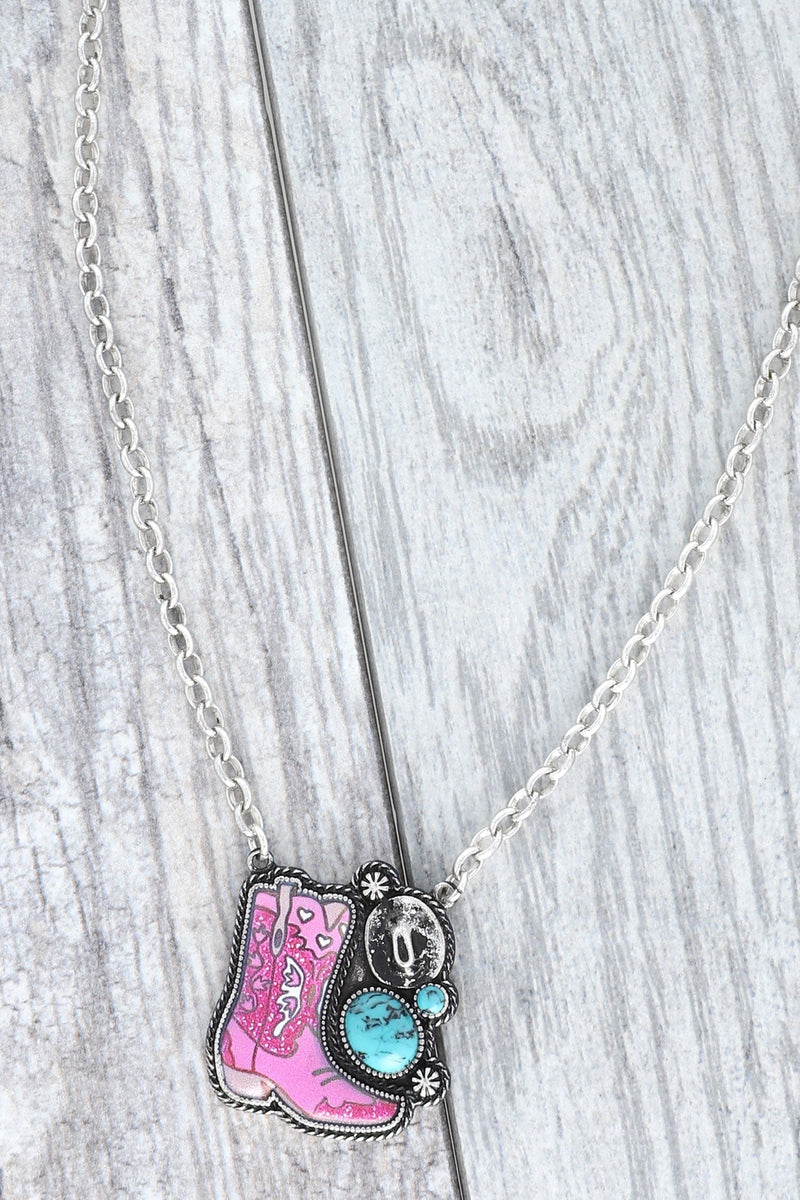 WESTERN TURQUOISE SEMI STONE ENAMEL COATED RODEO COWBOY BOOT AND HAT ADJUSTABLE PENDANT NECKLACE IN OXIDIZED SILVER TONE METAL LENGTH: 18" EXTENSION: 3" DROP: 1.35" COWBOY RODEO COWBOY BOOT COWBOY HAT ENAMEL COATED RESIN EPOXY TURQUOISE SEMI STONE GEMSTONE NATURAL COWGIRL STATEMENT SOUTHWESTERN COWBOY RODEO WILD WEST NATIVE AMERICAN SOUTHERN COUNTRY WESTERN PENDANT NECKLACE