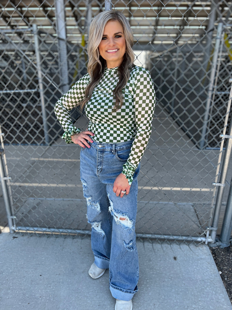 Get ready to stand out at your next pep rally with this quirky and playful green and white checked mesh top! Featuring a unique design, this top will bring some fun and excitement to your game day outfit. Show off your team spirit in style with the Pep Rally Mesh Top. Find all the matching accessories here as well! There is a wild rag, a latigo, and a scrunchie too!
