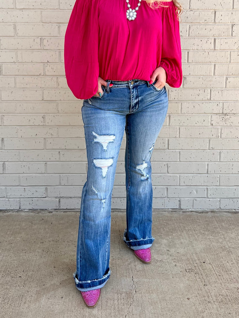Introducing The 806 Trouser Flare - the stretchy, distressed mid-rise dream you didn't know you needed! With a 9" rise and 34" inseam, you're sure to look ultra-fly, and it boasts a trouser-style hem for maximum legroom. Plus, it's outfitted with all the bells and whistles you need, including a button closure & zip fly, plus five pocket styling for all the stuff you stash. Get your groove on!